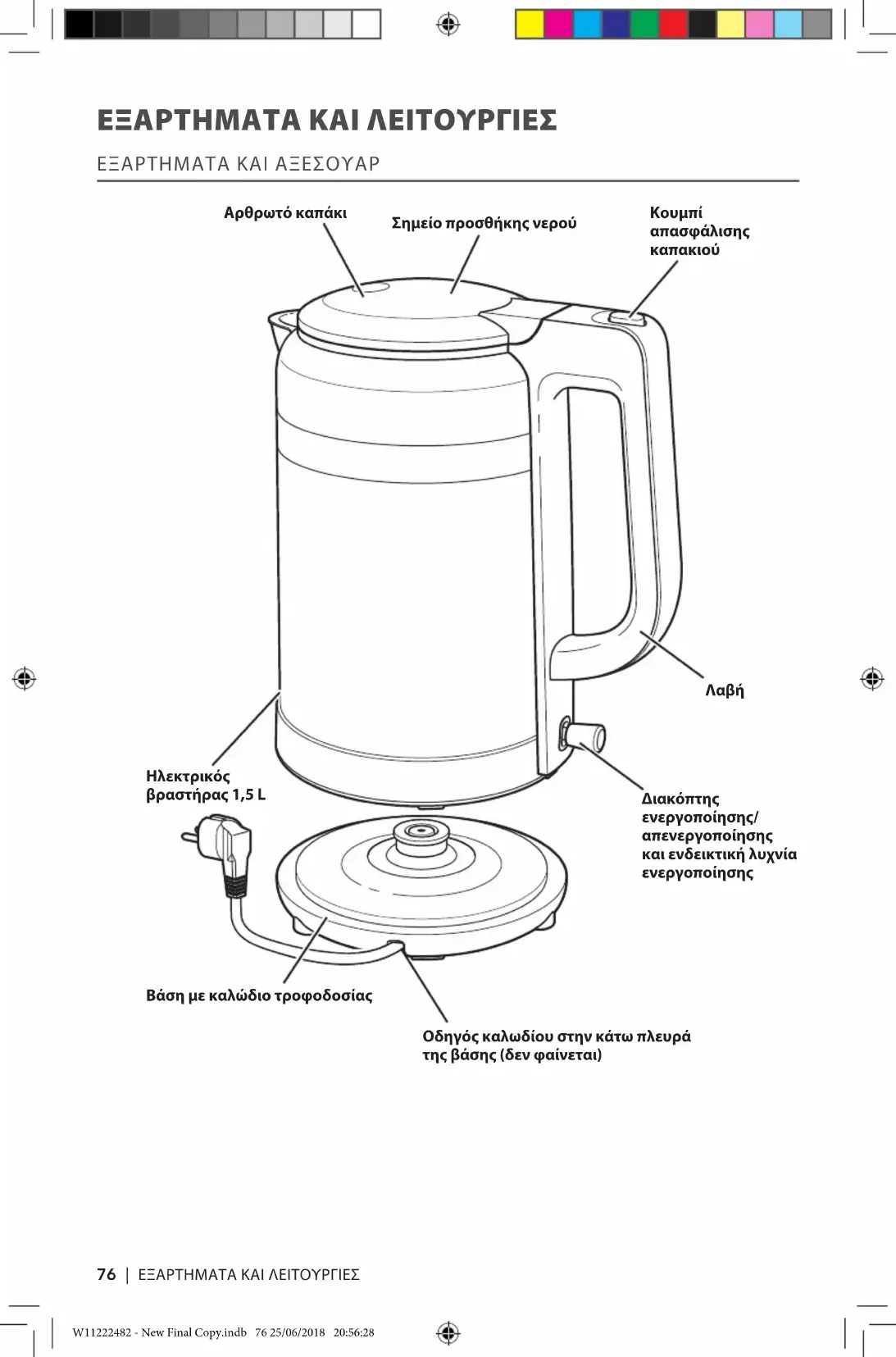 ΠΊΝΑΚΑΣ ΠΕΡΊΕΧΟΜΕΝΩΝ ΕΞΑΡΤΉΜΑΤΑ ΚΑΙ ΛΕΙΤΟΥΡΓΙΕΣ 76 Εξαρτήματα και αξεσουάρ 76 ΑΣΦΑΛΕΙΑ ΉΛΕΚΤΡΙΚΟΥ ΒΡΑΣΤΉΡΑ 77 Σημαντικές πληροφορίες ασφαλείας 77 Ηλεκτρικές απαιτήσεις 81 Απόρριψη αποβλήτων ειδών ηλεκτρικού εξοπλισμού 81 ΧΡΉΣΉ ΤΟΥ ΉΛΕΚΤΡΙΚΟΥ ΒΡΑΣΤΉΡΑ 82 Λειτουργία του ηλεκτρικού βραστήρα 82 ΦΡΟΝΤΙΔΑ ΚΑΙ ΚΑΘΑΡΙΣΜΟΣ 83 Καθαρισμός του ηλεκτρικού βραστήρα 83 Καθαρισμός αλάτων ηλεκτρικού βραστήρα 83 ΕΓΓΥΉΣΉ ΚΑΙ ΣΕΡΒΙΣ 84 W11222482 - New Final Copy.indb 75 25/06/2018 20:56:2876 | ΕΞΑΡΤΗΜΑΤΑ ΚΑΊ ΛΕΊΤΟΥΡΓΊΕΣ ΕΞΑΡΤΉΜΑΤΑ ΚΑΙ ΛΕΙΤΟΥΡΓΙΕΣ ΕΞΑΡΤΗΜΑΤΑ ΚΑΊ ΑΞΕΣΟΥΑΡ Σημείο προσθήκης νερού