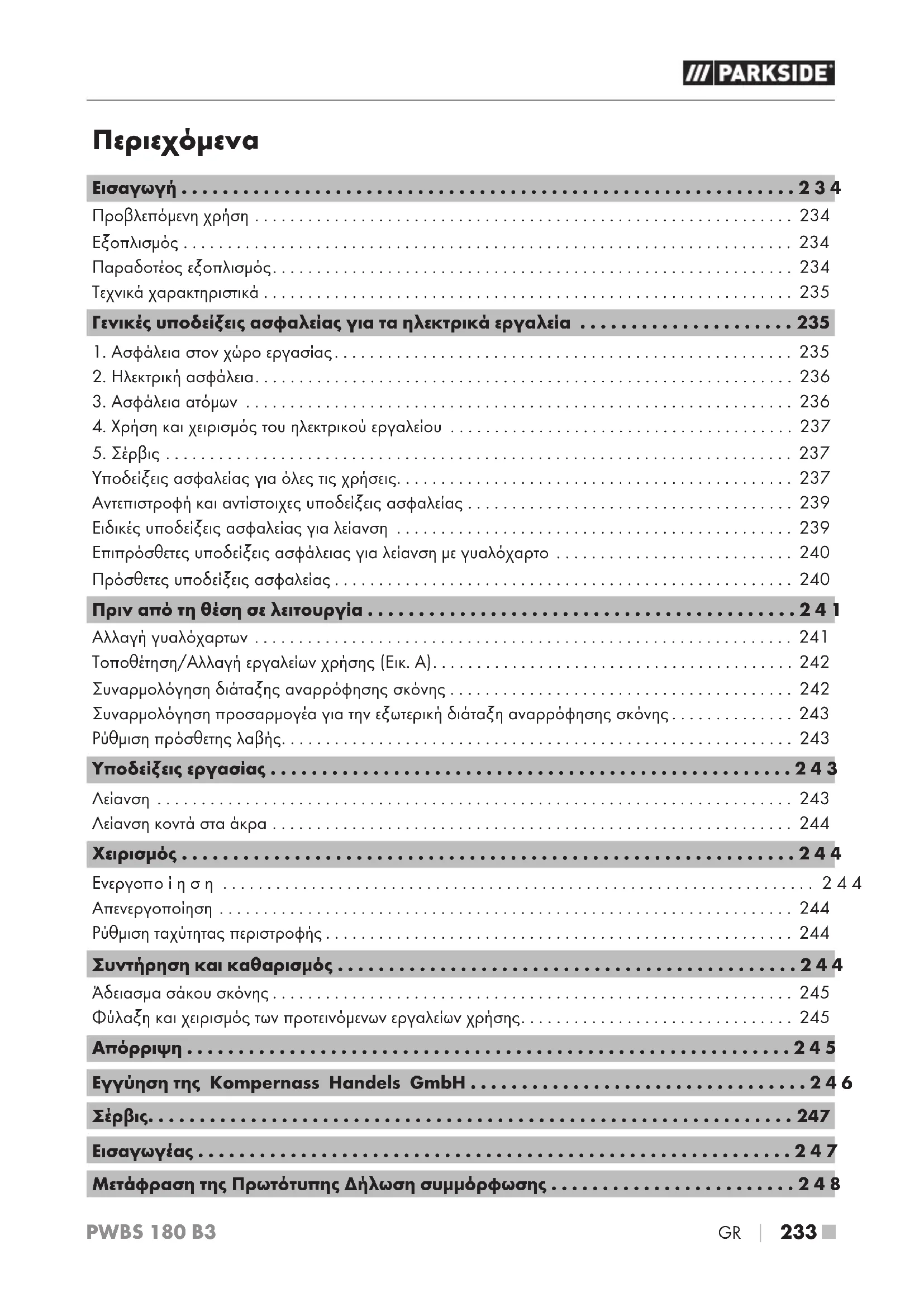 - Μετάφραση της Πρωτότυπης Δήλωση συμμόρφωσης PWBS 180 B3 ■ 234 p. 248