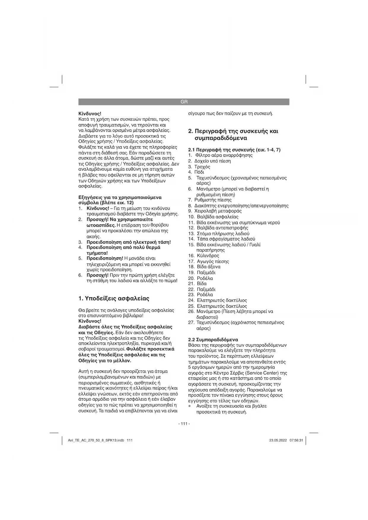 Ο συμπιεστής είναι κατάλληλος για χρήση σε στεγνούς χώρους. Σε σημεία όπου εκτελούνται εργασίες με πιτσιλίσματα νερού, δεν επιτρέπεται η χρήση του Anl_TE_AC_270_50_8_SPK13.indb 112Anl_TE_AC_270_50_8_SPK13.indb 112 23.05.2022 07:56:3223.05.2022 07:56:32GR
