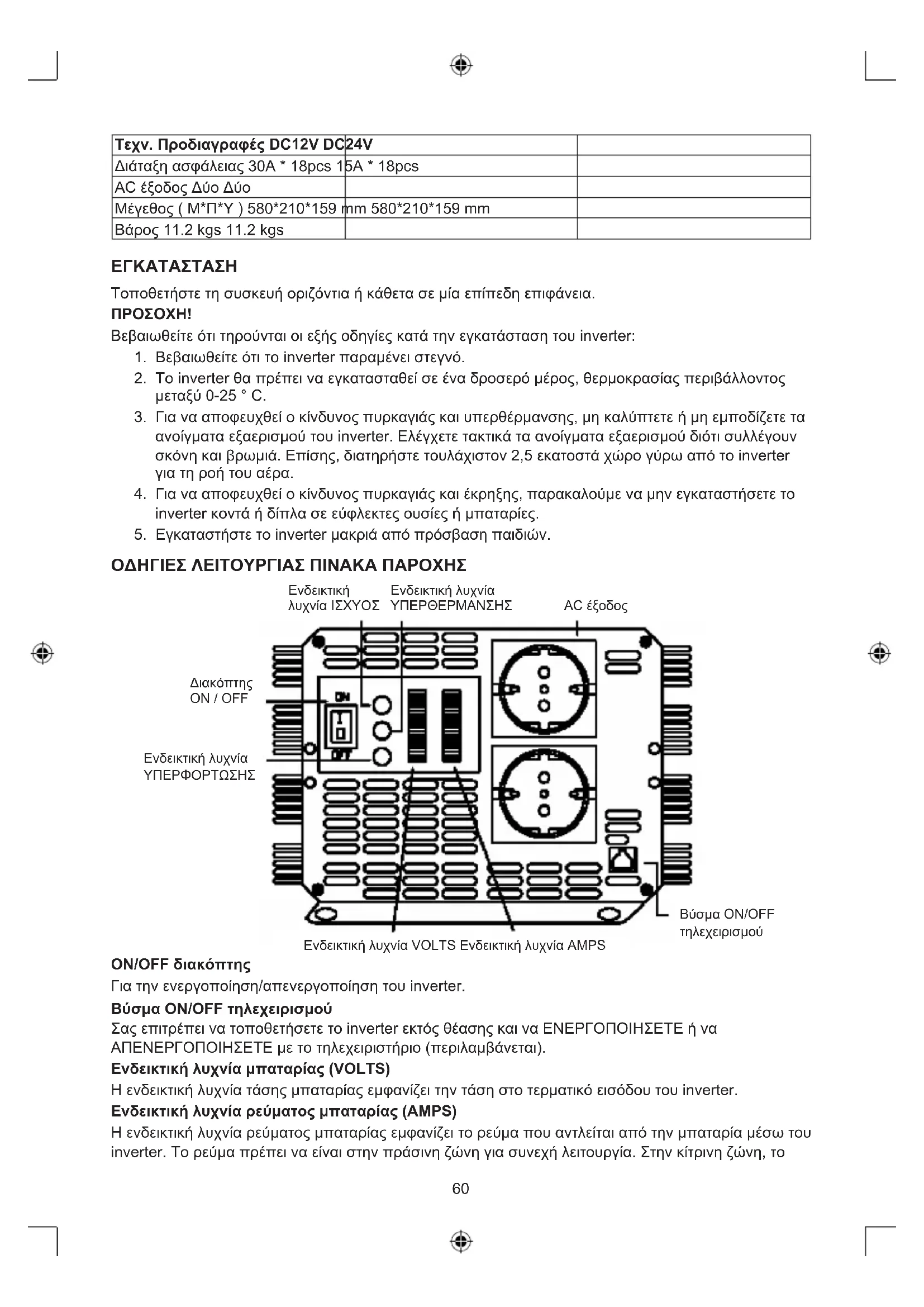 - υπερβολική θερμοκρασία60 Τεχν. Προδιαγραφές DC12V DC24V Διάταξη ασφάλειας 30A * 18pcs 15A * 18pcs AC έξοδος Δύο Δύο Μέγεθος ( Μ*Π*Υ ) 580*210*159 mm 580*210*159 mm Βάρος 11.2 kgs 11.2 kgs ΕΓΚΑΤΑΣΤΑΣΗ Τοποθετήστε τη συσκευή οριζόντια ή κάθετα σε μία επίπεδη επιφάνεια.