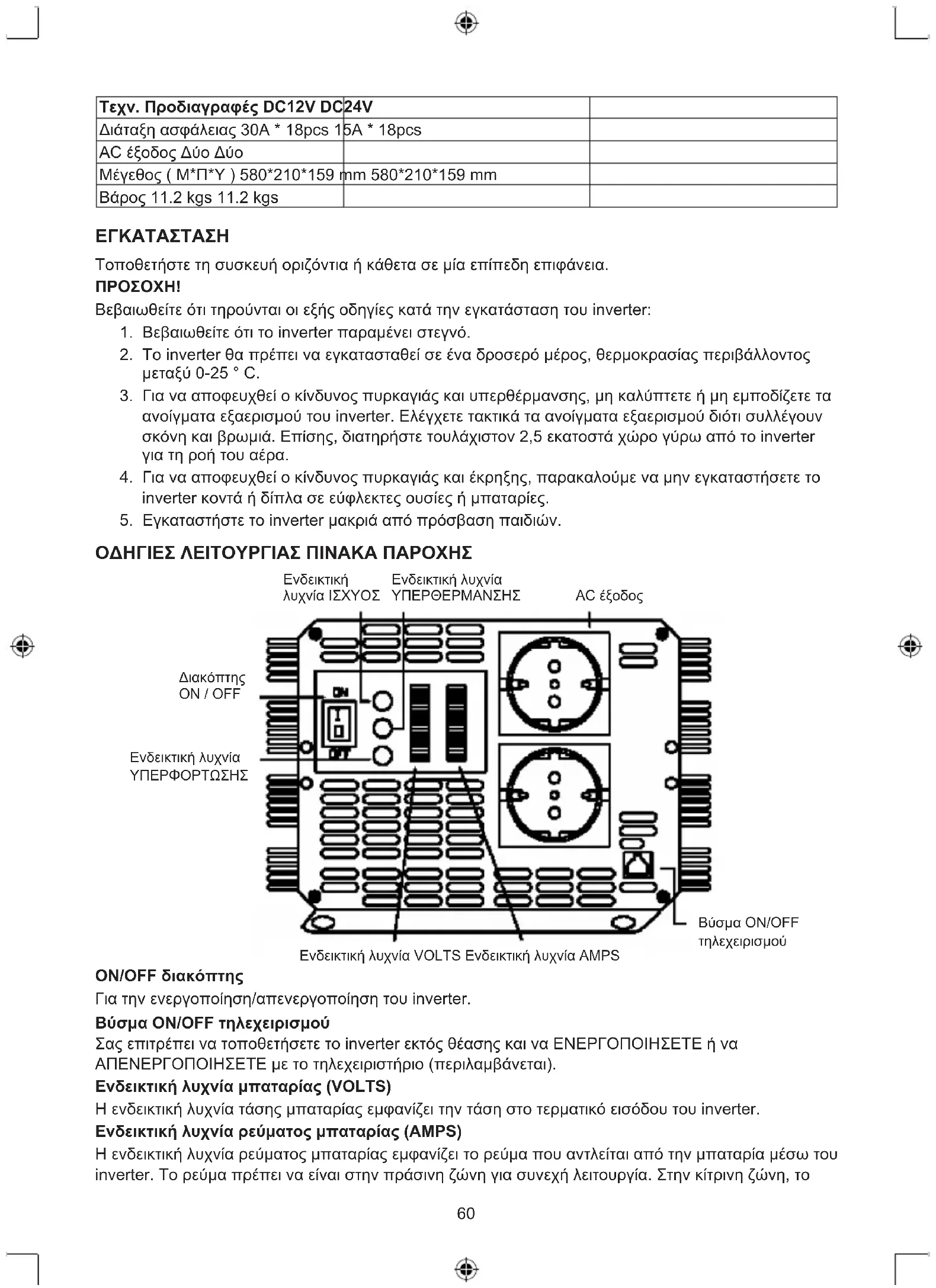 - υπερβολική θερμοκρασία60 Τεχν. Προδιαγραφές DC12V DC24V Διάταξη ασφάλειας 30A * 18pcs 15A * 18pcs AC έξοδος Δύο Δύο Μέγεθος ( Μ*Π*Υ ) 580*210*159 mm 580*210*159 mm Βάρος 11.2 kgs 11.2 kgs ΕΓΚΑΤΑΣΤΑΣΗ Τοποθετήστε τη συσκευή οριζόντια ή κάθετα σε μία επίπεδη επιφάνεια.