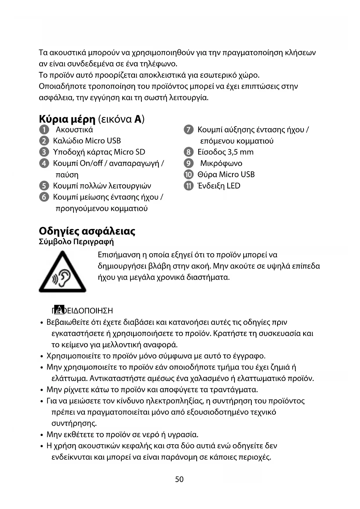 5 Κουμπί πολλών λειτουργιών 6 Κουμπί μείωσης έντασης ήχου / προηγούμενου κομματιού 7 Κουμπί αύξησης έντασης ήχου / επόμενου κομματιού 8 Είσοδος 3,5 mm 9 Μικρόφωνο q Θύρα Micro USB w Ένδειξη LED Οδηγίες ασφάλειας Σύμβολο Περιγραφή Επισήμανση η οποία εξηγεί ότι το προϊόν μπορεί να δημιουργήσει βλάβη στην ακοή. Μην ακούτε σε υψηλά επίπεδα ήχου για μεγάλα χρονικά διαστήματα.