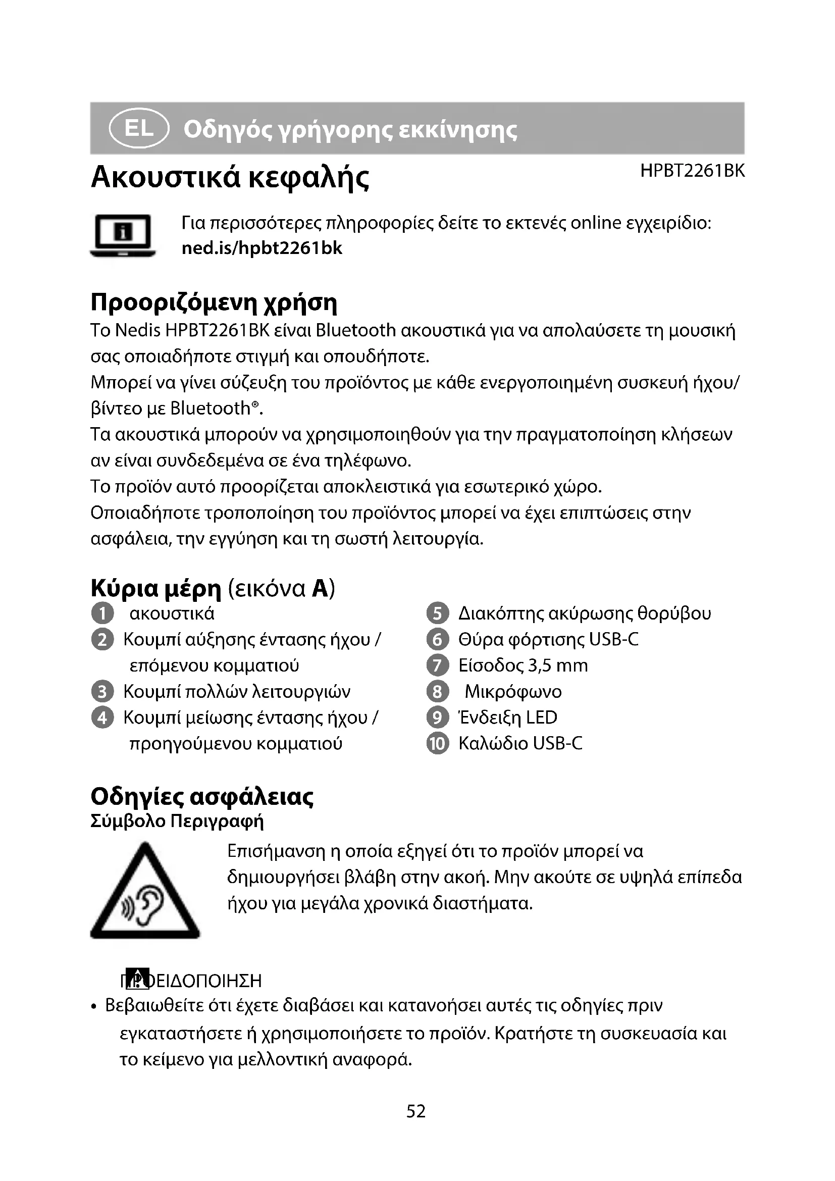 Οδηγός γρήγορης εκκίνησης Ακουστικά κεφαλής HPBT2261BKΓια περισσότερες πληροφορίες δείτε το εκτενές online εγχειρίδιο: ned.is/hpbt2261bk Προοριζόμενη χρήση Το Nedis HPBT2261BK είναι Bluetooth ακουστικά για να απολαύσετε τη μουσική σας οποιαδήποτε στιγμή και οπουδήποτε.Μπορεί να γίνει σύζευξη του προϊόντος με κάθε ενεργοποιημένη συσκευή ήχου/βίντεο με Bluetooth®.Τα ακουστικά μπορούν να χρησιμοποιηθούν για την πραγματοποίηση κλήσεων αν είναι συνδεδεμένα σε ένα τηλέφωνο.Το προϊόν αυτό προορίζεται αποκλειστικά για εσωτερικό χώρο.Οποιαδήποτε τροποποίηση του προϊόντος μπορεί να έχει επιπτώσεις στην ασφάλεια, την εγγύηση και τη σωστή λειτουργία. Κύρια μέρη (εικόνα A) 1 ακουστικά 2 Κουμπί αύξησης έντασης ήχου / επόμενου κομματιού 3 Κουμπί πολλών λειτουργιών 4 Κουμπί μείωσης έντασης ήχου / προηγούμενου κομματιού 5 Διακόπτης ακύρωσης θορύβου 6 Θύρα φόρτισης USB-C 7 Είσοδος 3,5 mm 8 Μικρόφωνο 9 Ένδειξη LED q Καλώδιο USB-C Οδηγίες ασφάλειας Σύμβολο ΠεριγραφήΕπισήμανση η οποία εξηγεί ότι το προϊόν μπορεί να δημιουργήσει βλάβη στην ακοή. Μην ακούτε σε υψηλά επίπεδα ήχου για μεγάλα χρονικά διαστήματα. ΠΡΟΕΙΔΟΠΟΙΗΣΗ• Βεβαιωθείτε ότι έχετε διαβάσει και κατανοήσει αυτές τις οδηγίες πριν εγκαταστήσετε ή χρησιμοποιήσετε το προϊόν. Κρατήστε τη συσκευασία και το κείμενο για μελλοντική αναφορά.53
