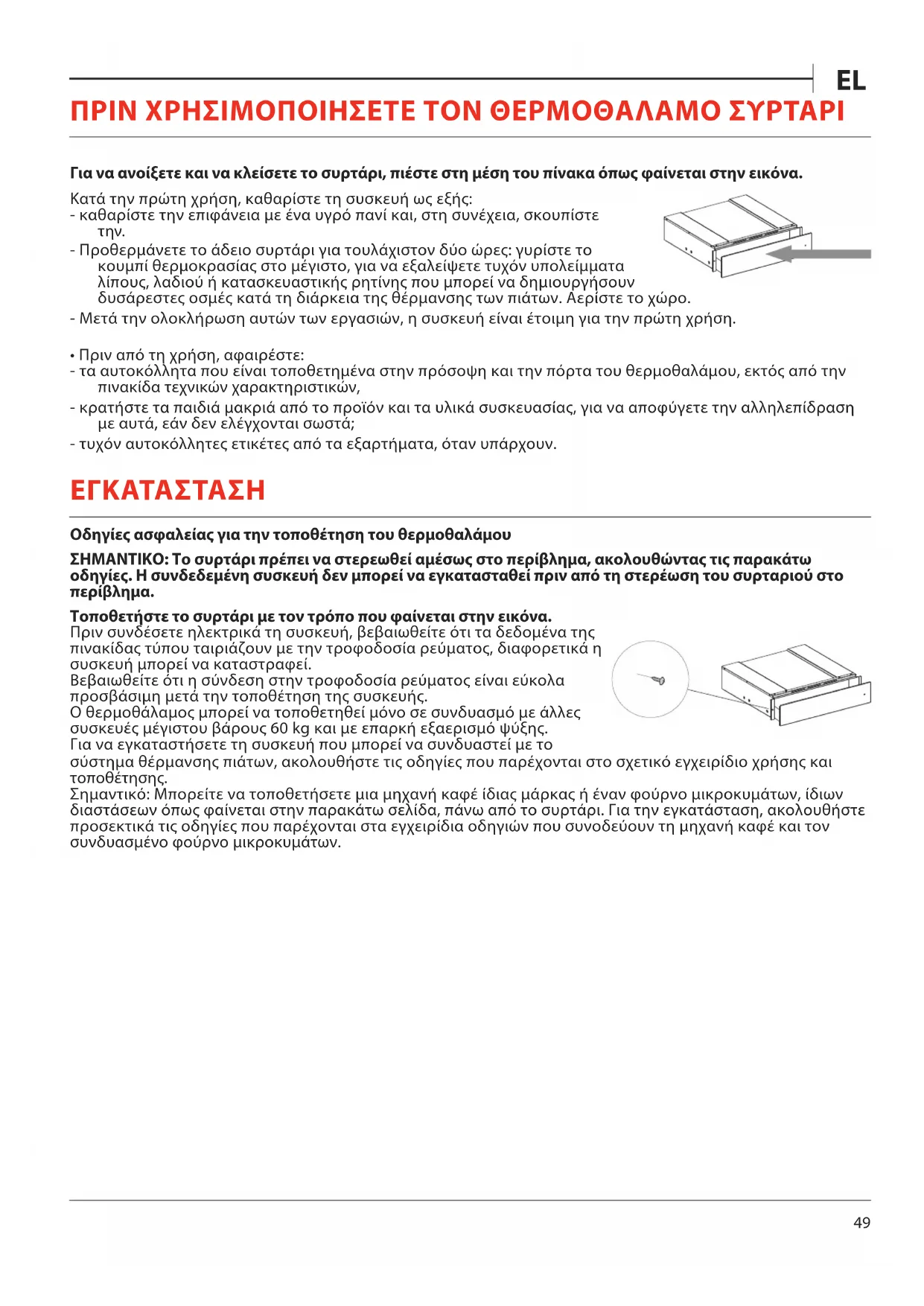 ΠΡΙΝ ΧΡΗΣΙΜΟΠΟΙΗΣΕΤΕ ΤΟΝ ΘΕΡΜΟΘΑΛΑΜΟ ΣΥΡΤΑΡΙ Για να ανοίξετε και να κλείσετε το συρτάρι, πιέστε στη μέση του πίνακα όπως φαίνεται στην εικόνα. Κατά την πρώτη χρήση, καθαρίστε τη συσκευή ως εξής: - καθαρίστε την επιφάνεια με ένα υγρό πανί και, στη συνέχεια, σκουπίστε