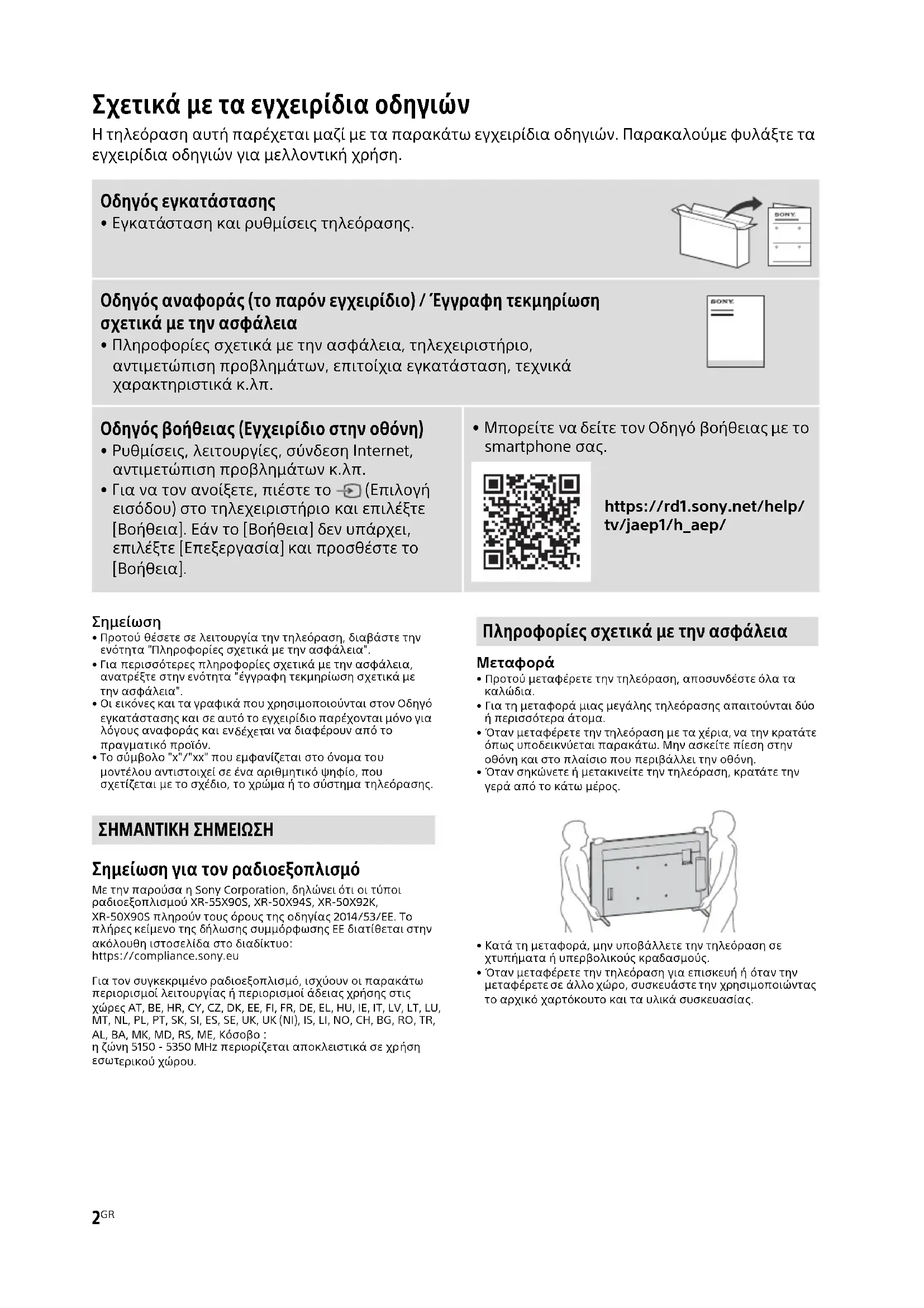 - Μπορείτε να δείτε τον Οδηγό βοήθειας με το smartphone σας. https://rd1.sony.net/help/ tv/jaep1/h_aep/ ΣΗΜΑΝΤΙΚΗ ΣΗΜΕΙΩΣΗ Πληροφορίες σχετικά με την ασφάλεια3