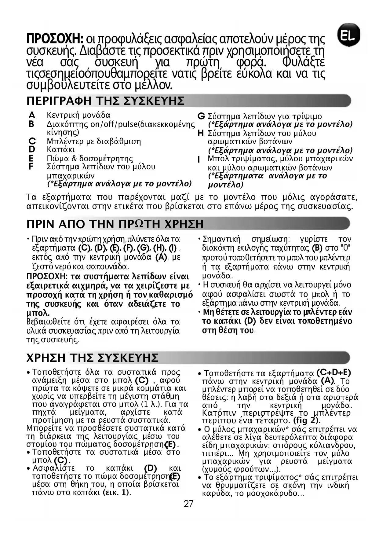 - Πριν από τηνπρώτη χρήση, πλύνετε όλα τα εξαρτήματα (C), (D), (E), (F), (G), (H), (I) , εκτός από την κεντρική μονάδα (A), με ζεστό νερό και σαπουνάδα. ΠΡΟΣΟΧΗ: τα συστήματα λεπίδων είναι εξαιρετικά αιχμηρά, να τα χειρίζεστε με προσοχή κατά τη χρήση ή τον καθαρισμό της συσκευής και όταν αδειάζετε το