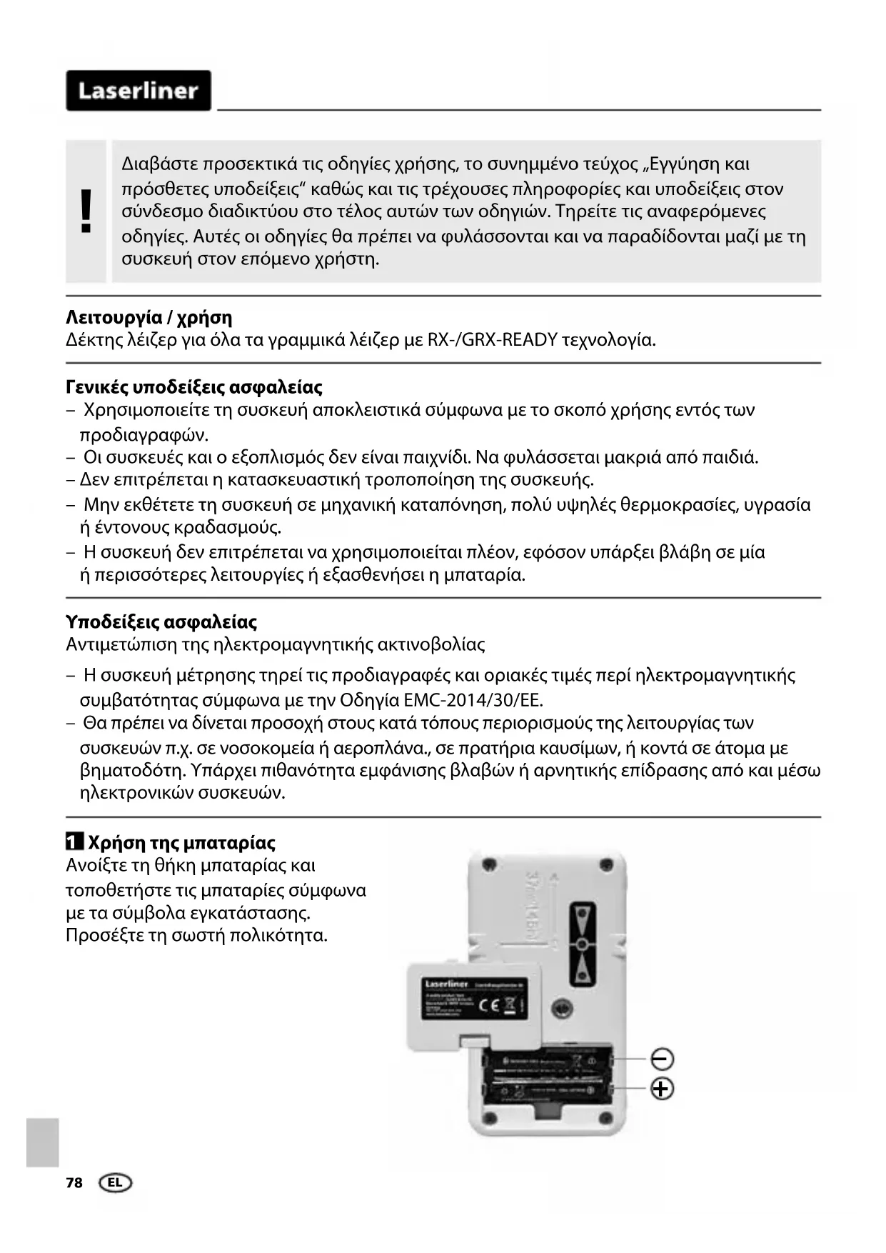 Γενικές υποδείξεις ασφαλείας – Χρησιμοποιείτε τη συσκευή αποκλειστικά σύμφωνα με το σκοπό χρήσης εντός των προδιαγραφών. – Οι συσκευές και ο εξοπλισμός δεν είναι παιχνίδι. Να φυλάσσεται μακριά από παιδιά. – Δεν επιτρέπεται η κατασκευαστική τροποποίηση της συσκευής. – Μην εκθέτετε τη συσκευή σε μηχανική καταπόνηση, πολύ υψηλές θερμοκρασίες, υγρασία ή έντονους κραδασμούς. – Η συσκευή δεν επιτρέπεται να χρησιμοποιείται πλέον, εφόσον υπάρξει βλάβη σε μία ή περισσότερες λειτουργίες ή εξασθενήσει η μπαταρία. Υποδείξεις ασφαλείας Αντιμετώπιση της ηλεκτρομαγνητικής ακτινοβολίας – Η συσκευή μέτρησης τηρεί τις προδιαγραφές και οριακές τιμές περί ηλεκτρομαγνητικής συμβατότητας σύμφωνα με την Οδηγία EMC-2014/30/EΕ. – Θα πρέπει να δίνεται προσοχή στους κατά τόπους περιορισμούς της λειτουργίας των συσκευών π.χ. σε νοσοκομεία ή αεροπλάνα., σε πρατήρια καυσίμων, ή κοντά σε άτομα με βηματοδότη. Υπάρχει πιθανότητα εμφάνισης βλαβών ή αρνητικής επίδρασης από και μέσω ηλεκτρονικών συσκευών. Λειτουργία / χρήση Δέκτης λέιζερ για όλα τα γραμμικά λέιζερ με RX-/GRX-READY τεχνολογία. Χρήση της μπαταρίας Ανοίξτε τη θήκη μπαταρίας και τοποθετήστε τις μπαταρίες σύμφωνα με τα σύμβολα εγκατάστασης. Προσέξτε τη σωστή πολικότητα.