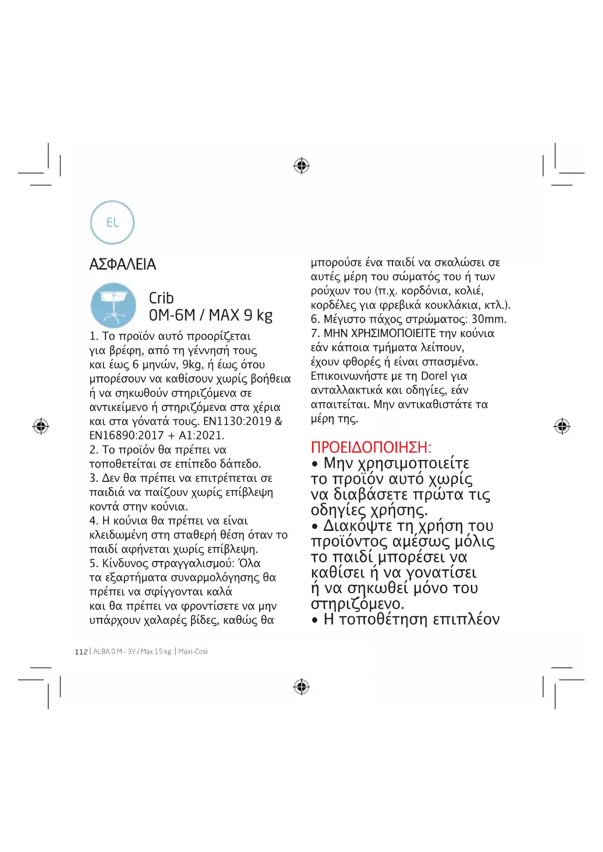 για βρέφη, από τη γέννησή τους και έως 6 μηνών, 9kg, ή έως ότου μπορέσουν να καθίσουν χωρίς βοήθεια ή να σηκωθούν στηριζόμενα σε αντικείμενο ή στηριζόμενα στα χέρια και στα γόνατά τους. EN1130:2019 & EN16890:2017 + A1:2021.