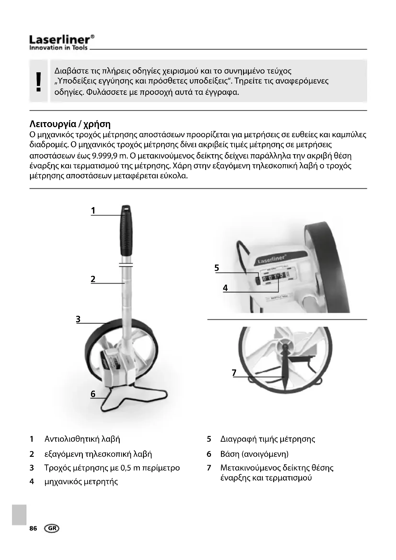 Λειτουργία / χρήση Ο μηχανικός τροχός μέτρησης αποστάσεων προορίζεται για μετρήσεις σε ευθείες και καμπύλες διαδρομές. Ο μηχανικός τροχός μέτρησης δίνει ακριβείς τιμές μέτρησης σε μετρήσεις αποστάσεων έως 9.999,9 m. Ο μετακινούμενος δείκτης δείχνει παράλληλα την ακριβή θέση έναρξης και τερματισμού της μέτρησης. Χάρη στην εξαγόμενη τηλεσκοπική λαβή ο τροχός μέτρησης αποστάσεων μεταφέρεται εύκολα. Αντιολισθητική λαβή εξαγόμενη τηλεσκοπική λαβή Τροχός μέτρησης με 0,5 m περίμετρο μηχανικός μετρητής Διαγραφή τιμής μέτρησης Βάση (ανοιγόμενη) Μετακινούμενος δείκτης θέσης έναρξης και τερματισμού