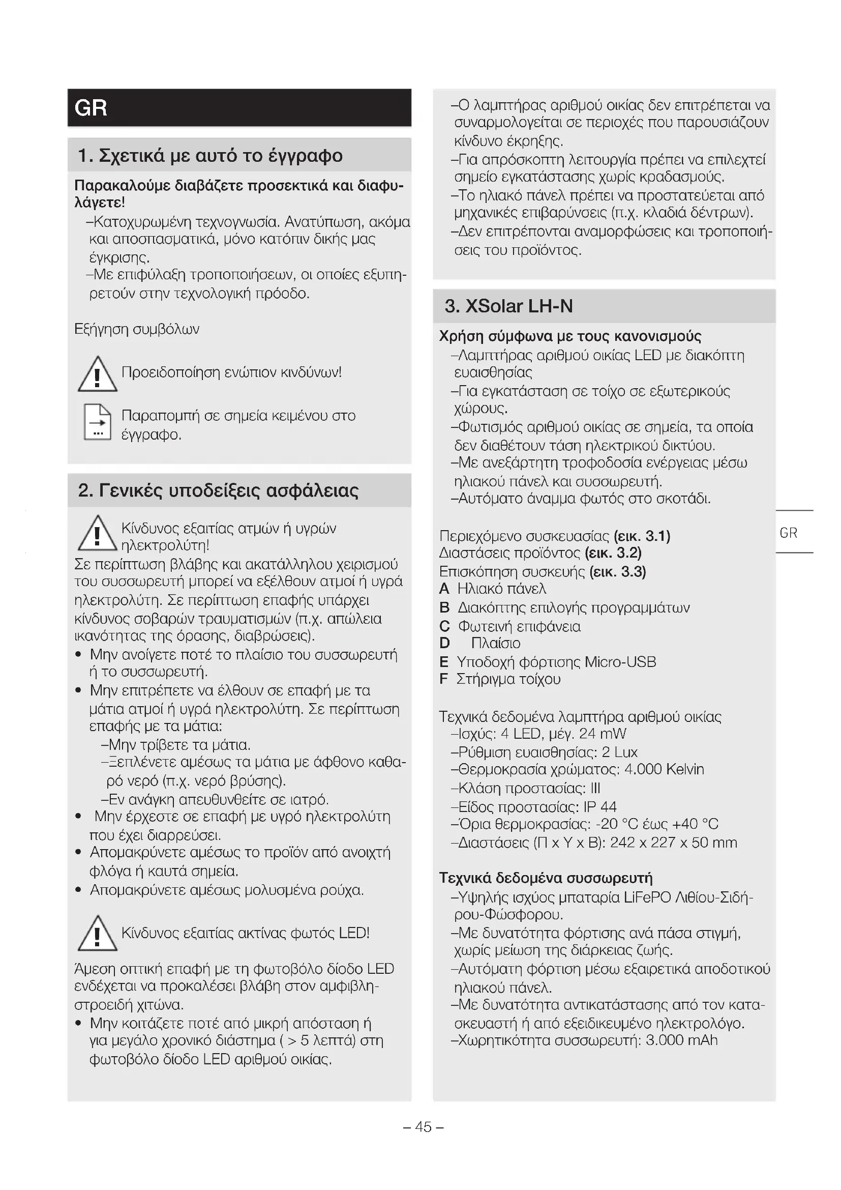 – Φωτισμός αριθμού οικίας σε σημεία, τα οποία δεν διαθέτουν τάση ηλεκτρικού δικτύου. – Με ανεξάρτητη τροφοδοσία ενέργειας μέσω ηλιακού πάνελ και συσσωρευτή. – Aυτόματο άναμμα φωτός στο σκοτάδι. Περιεχόμενο συσκευασίας (εικ 31) Διαστάσεις προϊόντος (εικ 32) Επισκόπηση συσκευής (εικ 33) A Ηλιακό πάνελ B Διακόπτης επιλογής προγραμμάτων C Φωτεινή επιφάνεια D Πλαίσιο E Υποδοχή φόρτισης Micro-USB F Στήριγμα τοίχου Tεχνικά δεδομένα λαμπτήρα αριθμού οικίας – Ισχύς: 4 LED, μέγ. 24 mW – Ρύθμιση ευαισθησίας: 2 Lux – Θερμοκρασία χρώματος: 4.000 Kelvin – Κλάση προστασίας: III – Είδος προστασίας: IP 44 – Όρια θερμοκρασίας: -20 °C έως +40°C – Διαστάσεις (ΠxΥxΒ): 242 x 227 x 50 mm Tεχνικά δεδομένα συσσωρευτή – Υψηλής ισχύος μπαταρία LiFePO Λιθίου-Σιδή- ρου-Φώσφορου. – Με δυνατότητα φόρτισης ανά πάσα στιγμή, χωρίς μείωση της διάρκειας ζωής. – Αυτόματη φόρτιση μέσω εξαιρετικά αποδοτικού ηλιακού πάνελ. – Με δυνατότητα αντικατάστασης από τον κατα- σκευαστή ή από εξειδικευμένο ηλεκτρολόγο. – Χωρητικότητα συσσωρευτή: 3.000mAh GR– 46 – – Μέγιστη διάρκεια φωτισμού με μία φόρτιση της μπαταρίας χωρίς επαναφόρτιση: 60 ημέρες με 20 συνδέσεις ανά νύχτα. – Υποδοχή φόρτισης Micro-USB: 5 V, max. 1 A. Ο χρόνος φόρτισης εξαρτάται από το σημείο εγκα- τάστασης (άμεσο ηλιακό φως). Το χειμώνα ή σε βροχερές ημέρες ο χρόνος φόρτισης υπολογίζεται ότι είναι πολύ μακρύτερος. 4 Εγκατάσταση