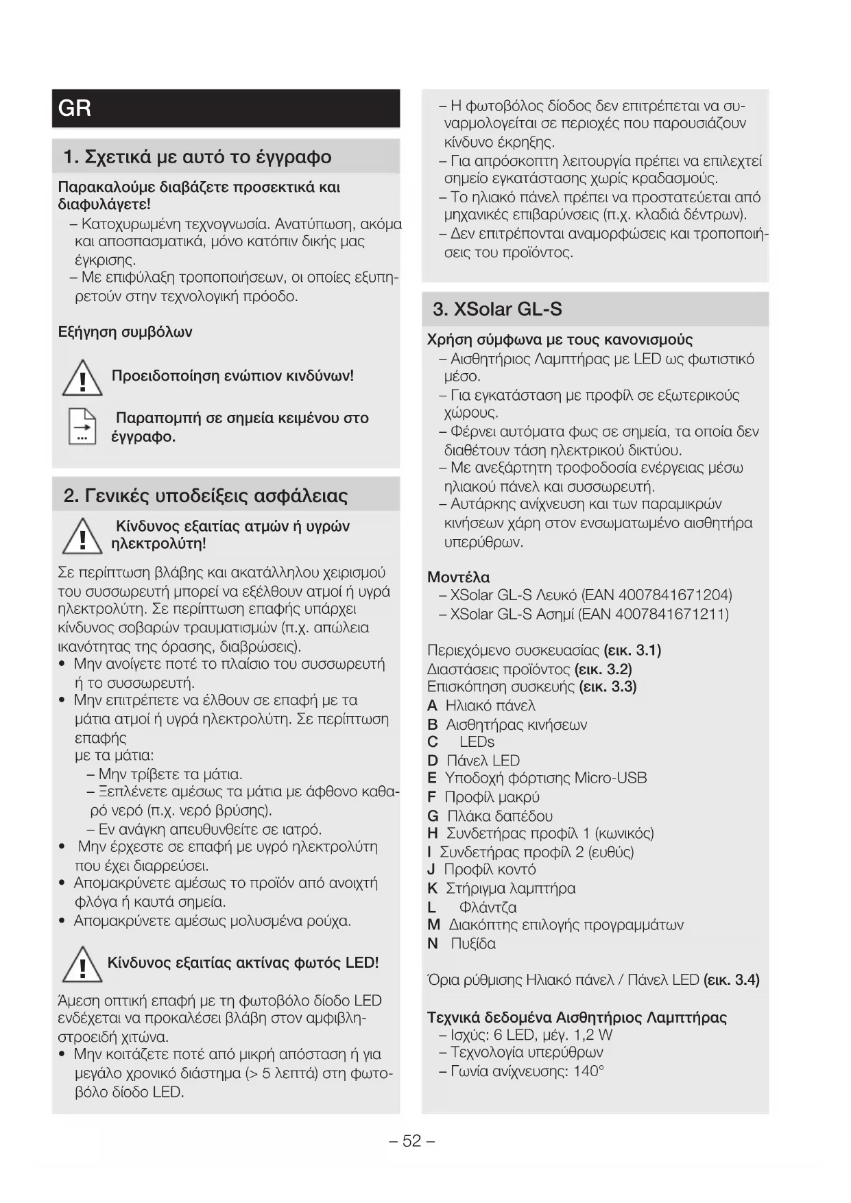 – XSolar GL-S Λευκό (EAN4007841671204) – XSolar GL-S Ασημί (EAN4007841671211) Περιεχόμενο συσκευασίας (εικ. 3.1) Διαστάσεις προϊόντος (εικ. 3.2) Επισκόπηση συσκευής (εικ. 3.3) A Ηλιακό πάνελ B Αισθητήρας κινήσεων C LEDs D Πάνελ LED E Υποδοχή φόρτισης Micro-USB F Προφίλ μακρύ G Πλάκα δαπέδου H Συνδετήρας προφίλ 1 (κωνικός) I Συνδετήρας προφίλ 2 (ευθύς) J Προφίλ κοντό K Στήριγμα λαμπτήρα L Φλάντζα M Διακόπτης επιλογής προγραμμάτων N Πυξίδα Όρια ρύθμισης Ηλιακό πάνελ/Πάνελ LED (εικ. 3.4) Tεχνικά δεδομένα Αισθητήριος Λαμπτήρας – Ισχύς: 6 LED, μέγ. 1,2 W – Τεχνολογία υπερύθρων – Γωνία ανίχνευσης: 140°– 53 – – Eμβέλεια ανίχνευσης: μέγ. 5,0 m (ύψος εγκατά- στασης 1,0 m) – Φωτισμός επιφανειών: 20 m