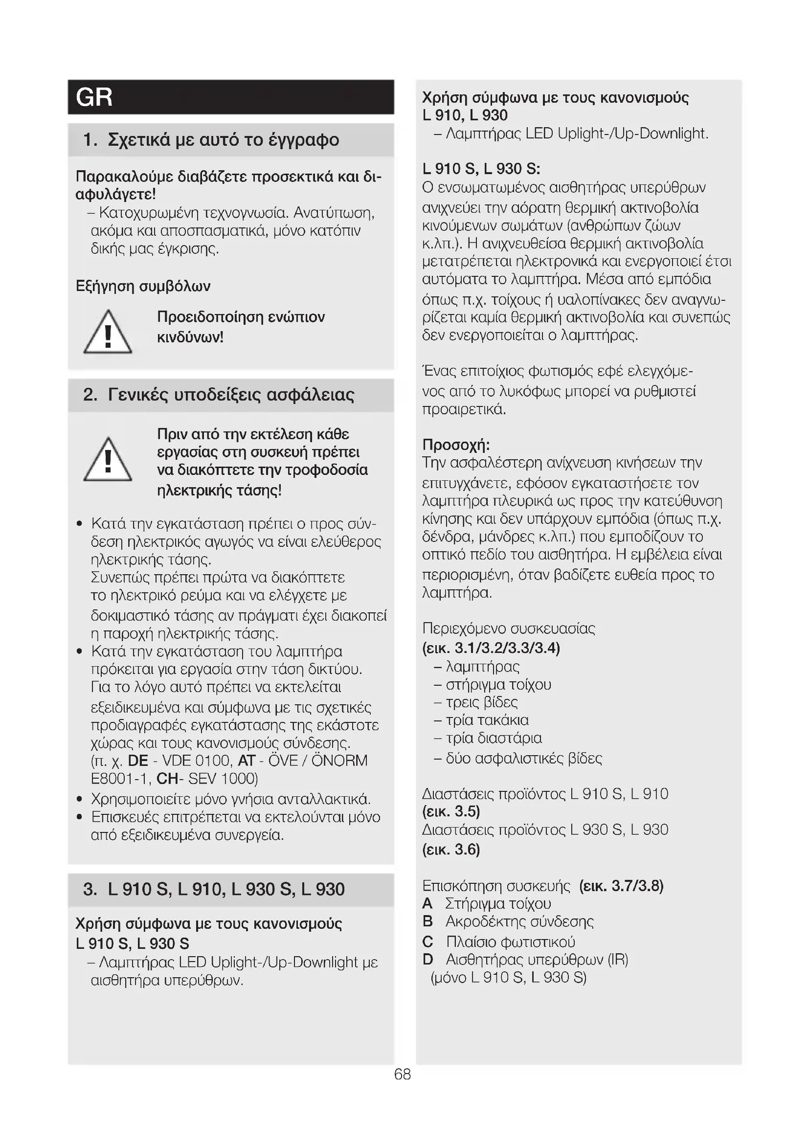 - Επισκευές επιτρέπεται να εκτελούνται μόνο από εξειδικευμένα συνεργεία. 3 L910S, L910, L930S, L930 Χρήση σύμφωνα με τους κανονισμούς L910S, L930S – Λαμπτήρας LED Uplight-/Up-Downlight με αισθητήρα υπερύθρων. Χρήση σύμφωνα με τους κανονισμούς L910, L930 – Λαμπτήρας LED Uplight-/Up-Downlight. L910S, L930S: Ο ενσωματωμένος αισθητήρας υπερύθρων ανιχνεύει την αόρατη θερμική ακτινοβολία κινούμενων σωμάτων (ανθρώπων ζώων κ.λπ.). Η ανιχνευθείσα θερμική ακτινοβολία μετατρέπεται ηλεκτρονικά και ενεργοποιεί έτσι αυτόματα το λαμπτήρα. Μέσα από εμπόδια όπως π.χ. τοίχους ή υαλοπίνακες δεν αναγνω- ρίζεται καμία θερμική ακτινοβολία και συνεπώς δεν ενεργοποιείται ο λαμπτήρας. Ένας επιτοίχιος φωτισμός εφέ ελεγχόμε- νος από το λυκόφως μπορεί να ρυθμιστεί προαιρετικά.