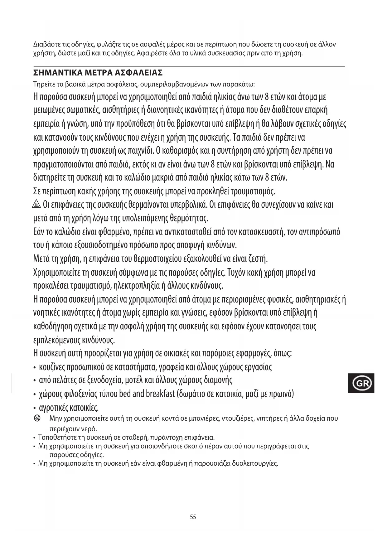 Τηρείτε τα βασικά μέτρα ασφάλειας, συμπεριλαμβανομένων των παρακάτω: Η παρούσα συσκευή μπορεί να χρησιμοποιηθεί από παιδιά ηλικίας άνω των 8 ετών και άτομα με μειωμένες σωματικές, αισθητήριες ή διανοητικές ικανότητες ή άτομα που δεν διαθέτουν επαρκή εμπειρία ή γνώση, υπό την προϋπόθεση ότι θα βρίσκονται υπό επίβλεψη ή θα λάβουν σχετικές οδηγίες και κατανοούν τους κινδύνους που ενέχει η χρήση της συσκευής. Τα παιδιά δεν πρέπει να χρησιμοποιούν τη συσκευή ως παιχνίδι. Ο καθαρισμός και η συντήρηση από χρήστη δεν πρέπει να πραγματοποιούνται από παιδιά, εκτός κι αν είναι άνω των 8 ετών και βρίσκονται υπό επίβλεψη. Να διατηρείτε τη συσκευή και το καλώδιο μακριά από παιδιά ηλικίας κάτω των 8 ετών. Σε περίπτωση κακής χρήσης της συσκευής μπορεί να προκληθεί τραυματισμός. h Οι επιφάνειες της συσκευής θερμαίνονται υπερβολικά. Οι επιφάνειες θα συνεχίσουν να καίνε και μετά από τη χρήση λόγω της υπολειπόμενης θερμότητας. Εάν το καλώδιο είναι φθαρμένο, πρέπει να αντικατασταθεί από τον κατασκευαστή, τον αντιπρόσωπό του ή κάποιο εξουσιοδοτημένο πρόσωπο προς αποφυγή κινδύνων. Μετά τη χρήση, η επιφάνεια του θερμοστοιχείου εξακολουθεί να είναι ζεστή. Χρησιμοποιείτε τη συσκευή σύμφωνα με τις παρούσες οδηγίες. Τυχόν κακή χρήση μπορεί να προκαλέσει τραυματισμό, ηλεκτροπληξία ή άλλους κινδύνους. Η παρούσα συσκευή μπορεί να χρησιμοποιηθεί από άτομα με περιορισμένες φυσικές, αισθητηριακές ή νοητικές ικανότητες ή άτομα χωρίς εμπειρία και γνώσεις, εφόσον βρίσκονται υπό επίβλεψη ή καθοδήγηση σχετικά με την ασφαλή χρήση της συσκευής και εφόσον έχουν κατανοήσει τους εμπλεκόμενους κινδύνους. Η συσκευή αυτή προορίζεται για χρήση σε οικιακές και παρόμοιες εφαρμογές, όπως: