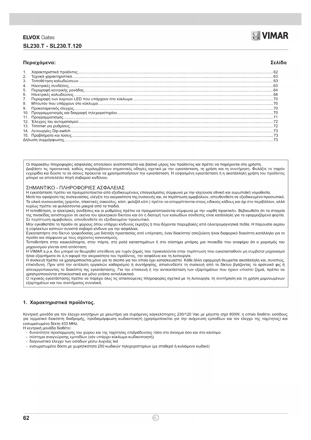 - Δήλωση συμμόρφωσης Οι παρακάτω πληροφορίες ασφαλείας αποτελούν αναπόσπαστο και βασικό μέρος του προϊόντος και πρέπει να παρέχονται στο χρήστη. Διαβάστε τις προσεκτικά, καθώς περιλαμβάνουν σημαντικές οδηγίες σχετικά με την εγκατάσταση, τη χρήση και τη συντήρηση. Φυλάξτε το παρόν εγχειρίδιο και δώστε το σε όσους πρόκειται να χρησιμοποιήσουν την εγκατάσταση. Η εσφαλμένη εγκατάσταση ή η ακατάλληλη χρήση του προϊόντος μπορεί να αποτελέσει πηγή σοβαρού κινδύνου. ΣΗΜΑΝΤΙΚΟ - ΠΛΗΡΟΦΟΡΙΕΣ ΑΣΦΑΛΕΙΑΣ Η εγκατάσταση πρέπει να πραγματοποιείται από εξειδικευμένους επαγγελματίες σύμφωνα με την ισχύουσα εθνική και ευρωπαϊκή νομοθεσία. Μετά την αφαίρεση της συσκευασίας, ελέγξτε την ακεραιότητα της συσκευής και, σε περίπτωση αμφιβολιών, απευθυνθείτε σε εξειδικευμένο προσωπικό. Τα υλικά συσκευασίας (χαρτόνι, πλαστικές σακούλες, κλιπ, φελιζόλ κλπ.) πρέπει να απορρίπτονται στους ειδικούς κάδους και όχι στο περιβάλλον, αλλά κυρίως πρέπει να φυλάσσονται μακριά από τα παιδιά. Η τοποθέτηση, οι ηλεκτρικές συνδέσεις και οι ρυθμίσεις πρέπει να πραγματοποιούνται σύμφωνα με την «ορθή πρακτική». Βεβαιωθείτε ότι τα στοιχεία της πινακίδας αντιστοιχούν σε εκείνα του ηλεκτρικού δικτύου και ότι η διατομή των καλωδίων σύνδεσης είναι κατάλληλη για τα εφαρμοζόμενα φορτία. Σε περίπτωση αμφιβολιών, απευθυνθείτε σε εξειδικευμένο προσωπικό. Μην εγκαθιστάτε το προϊόν σε χώρους όπου υπάρχει κίνδυνος έκρηξης ή που δέχονται παρεμβολές από ηλεκτρομαγνητικά πεδία. Η παρουσία αερίου ή εύφλεκτων καπνών συνιστά σοβαρό κίνδυνο για την ασφάλεια. Εγκαταστήστε στο δίκτυο τροφοδοσίας μια διάταξη προστασίας από υπέρταση, έναν διακόπτη/ αποζεύκτη ή/και διαφορικό διακόπτη κατάλληλο για το προϊόν και σύμφωνα με τους ισχύοντες κανονισμούς. Τοποθετήστε στην καγκελόπορτα, στην πόρτα, στο ρολό καταστημάτων ή στο σύστημα μπάρας μια πινακίδα που αναφέρει ότι ο χειρισμός του μηχανισμού γίνεται από απόσταση. Η VIMAR s.p.a. δεν μπορεί να θεωρηθεί υπεύθυνη για τυχόν ζημιές που προκαλούνται στην περίπτωση που εγκατασταθούν μη συμβατοί μηχανισμοί ή/και εξαρτήματα σε ό,τι αφορά την ακεραιότητα του προϊόντος, την ασφάλεια και τη λειτουργία. Η συσκευή πρέπει να χρησιμοποιείται μόνο για το σκοπό για τον οποίο έχει κατασκευαστεί. Κάθε άλλη εφαρμογή θεωρείται ακατάλληλη και, συνεπώς, επικίνδυνη. Πριν από την εκτέλεση εργασιών καθαρισμού ή συντήρησης, αποσυνδέστε τη συσκευή από το δίκτυο βγάζοντας το αρσενικό φις ή απενεργοποιώντας το διακόπτη της εγκατάστασης. Για την επισκευή ή την αντικατάσταση των εξαρτημάτων που έχουν υποστεί ζημιά, πρέπει να χρησιμοποιούνται αποκλειστικά και μόνο γνήσια ανταλλακτικά. Ο τεχνικός εγκατάστασης πρέπει να παρέχει όλες τις απαιτούμενες πληροφορίες σχετικά με τη λειτουργία, τη συντήρηση και τη χρήση μεμονωμένων εξαρτημάτων και του συστήματος συνολικά. p. 73