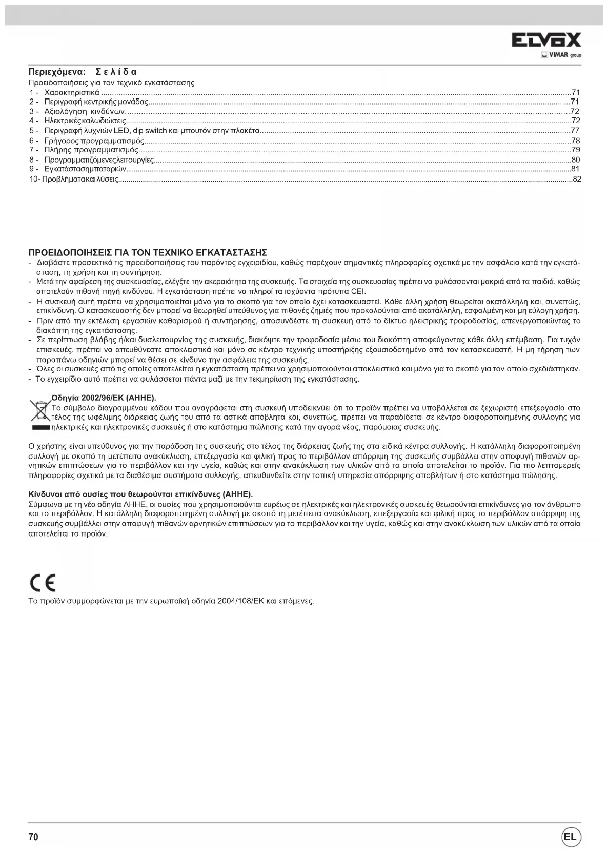 Μετά την αφαίρεση της συσκευασίας, ελέγξτε την ακεραιότητα της συσκευής. Τα στοιχεία της συσκευασίας πρέπει να φυλάσσονται μακριά από τα παιδιά, καθώς αποτελούν πιθανή πηγή κινδύνου. Η εγκατάσταση πρέπει να πληροί τα ισχύοντα πρότυπα CEI. - Η συσκευή αυτή πρέπει να χρησιμοποιείται μόνο για το σκοπό για τον οποίο έχει κατασκευαστεί. Κάθε άλλη χρήση θεωρείται ακατάλληλη και, συνεπώς, επικίνδυνη. Ο κατασκευαστής δεν μπορεί να θεωρηθεί υπεύθυνος για πιθανές ζημιές που προκαλούνται από ακατάλληλη, εσφαλμένη και μη εύλογη χρήση. - Πριν από την εκτέλεση εργασιών καθαρισμού ή συντήρησης, αποσυνδέστε τη συσκευή από το δίκτυο ηλεκτρικής τροφοδοσίας, απενεργοποιώντας το διακόπτη της εγκατάστασης. - Σε περίπτωση βλάβης ή/και δυσλειτουργίας της συσκευής, διακόψτε την τροφοδοσία μέσω του διακόπτη αποφεύγοντας κάθε άλλη επέμβαση. Για τυχόν επισκευές, πρέπει να απευθύνεστε αποκλειστικά και μόνο σε κέντρο τεχνικής υποστήριξης εξουσιοδοτημένο από τον κατασκευαστή. Η μη τήρηση των παραπάνω οδηγιών μπορεί να θέσει σε κίνδυνο την ασφάλεια της συσκευής. - Όλες οι συσκευές από τις οποίες αποτελείται η εγκατάσταση πρέπει να χρησιμοποιούνται αποκλειστικά και μόνο για το σκοπό για τον οποίο σχεδιάστηκαν. - Το εγχειρίδιο αυτό πρέπει να φυλάσσεται πάντα μαζί με την τεκμηρίωση της εγκατάστασης. Οδηγία 2002/96/ΕΚ (ΑΗΗΕ). Το σύμβολο διαγραμμένου κάδου που αναγράφεται στη συσκευή υποδεικνύει ότι το προϊόν πρέπει να υποβάλλεται σε ξεχωριστή επεξεργασία στο τέλος της ωφέλιμης διάρκειας ζωής του από τα αστικά απόβλητα και, συνεπώς, πρέπει να παραδίδεται σε κέντρο διαφοροποιημένης συλλογής για ηλεκτρικές και ηλεκτρονικές συσκευές ή στο κατάστημα πώλησης κατά την αγορά νέας, παρόμοιας συσκευής. Ο χρήστης είναι υπεύθυνος για την παράδοση της συσκευής στο τέλος της διάρκειας ζωής της στα ειδικά κέντρα συλλογής. Η κατάλληλη διαφοροποιημένη συλλογή με σκοπό τη μετέπειτα ανακύκλωση, επεξεργασία και φιλική προς το περιβάλλον απόρριψη της συσκευής συμβάλλει στην αποφυγή πιθανών αρ- νητικών επιπτώσεων για το περιβάλλον και την υγεία, καθώς και στην ανακύκλωση των υλικών από τα οποία αποτελείται το προϊόν. Για πιο λεπτομερείς πληροφορίες σχετικά με τα διαθέσιμα συστήματα συλλογής, απευθυνθείτε στην τοπική υπηρεσία απόρριψης αποβλήτων ή στο κατάστημα πώλησης. Κίνδυνοι από ουσίες που θεωρούνται επικίνδυνες (ΑΗΗΕ). Σύμφωνα με τη νέα οδηγία ΑΗΗΕ, οι ουσίες που χρησιμοποιούνται ευρέως σε ηλεκτρικές και ηλεκτρονικές συσκευές θεωρούνται επικίνδυνες για τον άνθρωπο και το περιβάλλον. Η κατάλληλη διαφοροποιημένη συλλογή με σκοπό τη μετέπειτα ανακύκλωση, επεξεργασία και φιλική προς το περιβάλλον απόρριψη της συσκευής συμβάλλει στην αποφυγή πιθανών αρνητικών επιπτώσεων για το περιβάλλον και την υγεία, καθώς και στην ανακύκλωση των υλικών από τα οποία αποτελείται το προϊόν. Το προϊόν συμμορφώνεται με την ευρωπαϊκή οδηγία 2004/108/ΕΚ και επόμενες. EL71