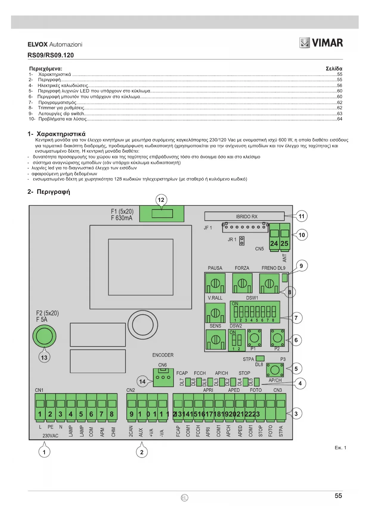 EL63 RS09/RS09.120 8- Λειτουργίες dip switch: μετά τη ρύθμιση των dip πρέπει να γεφυρώσετε για μερικά δευτερόλεπτα τις επαφές jr1 επαναφοράς ή να διακόψετε και να συνδέσετε ξανά την τροφοδοσία, καθώς η αλλαγή ενημερώνεται από την κεντρική μονάδα:Αριθμός dip switchΚατάσταση του dip ΠεριγραφήDIP 1-1 OFF Ενεργοποιημένη επιτάχυνση στην εκκίνησηDIP 1-1 ON Απενεργοποιημένη επιτάχυνση στην εκκίνησηDIP 1-2 OFF Μη ενεργοποιημένη προαναλαμπήDIP 1-2 ONΕνεργοποιημένη προαναλαμπή, πριν από την κίνηση της καγκελόπορτας το φλας ανάβει για 3 δευτερόλεπτα DIP 1-3 OFF Η έξοδος 2CAN είναι αντιστοιχισμένη στο δεύτερο κανάλι του τηλεχειριστηρίου DIP 1-3 ON Η έξοδος 2CAN χρησιμοποιείται για τροφοδοσία των πομπών των φωτοκυττάρων DIP 1-4 OFF Η είσοδος STPA χρησιμοποιείται για τη σύνδεση των ευαίσθητων άκρων με διακόπτη DIP 1-4 ON Η είσοδος STPA χρησιμοποιείται για τη σύνδεση των ωμικών ευαίσθητων άκρων DIP 1-5 OFFΑνατρέξτε στον πίνακα λογικών συστημάτων λειτουργίας για τις εισόδους ελέγχουDIP 1-5 ONDIP 1-6 OFFDIP 1-6 ONDIP 1-7 OFFDIP 1-7 ONDIP 1-8 OFF Μη ενεργοποιημένη λειτουργία fototest DIP 1-8 ON Ενεργοποιημένη λειτουργία fototest (έλεγχος των φωτοκυττάρων με κάθε εντολή), βλ. παράγραφο 4.8 DIP 2-1 OFF Για άνοιγμα της καγκελόπορτας προς τα δεξιάDIP 2-1 ON Για άνοιγμα της καγκελόπορτας προς τα αριστεράDIP 2-2 OFFΗ έξοδος AUX (επαφή κλέμας αρ. 10) αναβοσβήνει κατά την κίνηση της καγκελόπορτας, αναβοσβήνει αργά κατά το άνοιγμα, γρήγορα κατά το κλείσιμο, ανάβει σταθερά όταν η καγκελόπορτα είναι ανοικτή και σβήνει όταν η καγκελόπορτα είναι κλειστή DIP 2-2 ON Η έξοδος AUX (επαφή κλέμας αρ. 10) σβήνει μόνο όταν η καγκελόπορτα είναι πλήρως κλειστή Λογικά συστήματα λειτουργίας για εισόδους ελέγχου: Dip 5 Dip 6 Dip 7 Λογικό σύστημα OFF OFF OFF Λειτουργία πολυκατοικίας plus OFF OFF ON Λειτουργία πολυκατοικίας plus+ άμεσο κλείσιμο OFF ON OFF Αυτόματη λειτουργία OFF ON ON Αυτόματη λειτουργία+ άμεσο κλείσιμο ON ON OFF Λειτουργία πολυκατοικίας ON ON ON Λειτουργία πολυκατοικίας + άμεσο κλείσιμο ON OFF OFF Ημιαυτόματη λειτουργίαON OFF ON Βηματική λειτουργία Περιγραφή λογικών συστημάτων: Λειτουργία πολυκατοικίας plus: Η εντολή APCH, με την καγκελόπορτα κλειστή, ελέγχει το άνοιγμα, ενώ κατά τη φάση ανοίγματος παραβλέπεται. Όταν ολοκληρωθεί το άνοιγμα, η καγκελόπορτα παραμένει σε κατάσταση παύσης για το χρονικό διάστημα αναμονής. Η εντολή APCH κατά το διάστημα παύσης μηδενίζει το διάστημα αυτόματου κλεισίματος. Η εντολή APCH κατά το κλείσιμο ελέγχει το εκ νέου άνοιγμα της καγκελόπορτας. Αυτόματη λειτουργία: Η εντολή APCH, με την καγκελόπορτα κλειστή, ελέγχει το άνοιγμα. Κατά τη φάση ανοίγματος, ακινητοποιεί την καγκελόπορτα, ενώ εάν η εντολή επαναληφθεί, η καγκελόπορτα κλείνει. Στην περίπτωση πλήρους ανοίγματος, η καγκελόπορτα παραμένει σε κατάσταση παύσης για το χρονικό διάστημα αναμονής. Η εντολή APCH κατά το διάστημα παύσης προκαλεί κλείσιμο της καγκελόπορτας. Η εντολή APCH κατά το κλείσιμο ελέγχει το εκ νέου άνοιγμα της καγκελόπορτας. Λειτουργία πολυκατοικίας: όταν η καγκελόπορτα είναι κλειστή, η εντολή της εισόδου APCH ελέγχει το άνοιγμα. Κατά το άνοιγμα της καγκελόπορτας, η εντολή APCH παραβλέπεται από την κεντρική μονάδα. Όταν η καγκελόπορτα είναι πλήρως ανοικτή, παραμένει ανοικτή για το διάστημα αυτόματου κλεισίματος. Η εντολή APCH κατά την παύση προκαλεί κλείσιμο της καγκελόπορτας ενώ εάν η εντολή επαναληφθεί κατά το κλείσιμο ελέγχει το εκ νέου άνοιγμα της καγκελόπορτας. Ημιαυτόματη λειτουργία: όταν η καγκελόπορτα είναι κλειστή, η εντολή τη