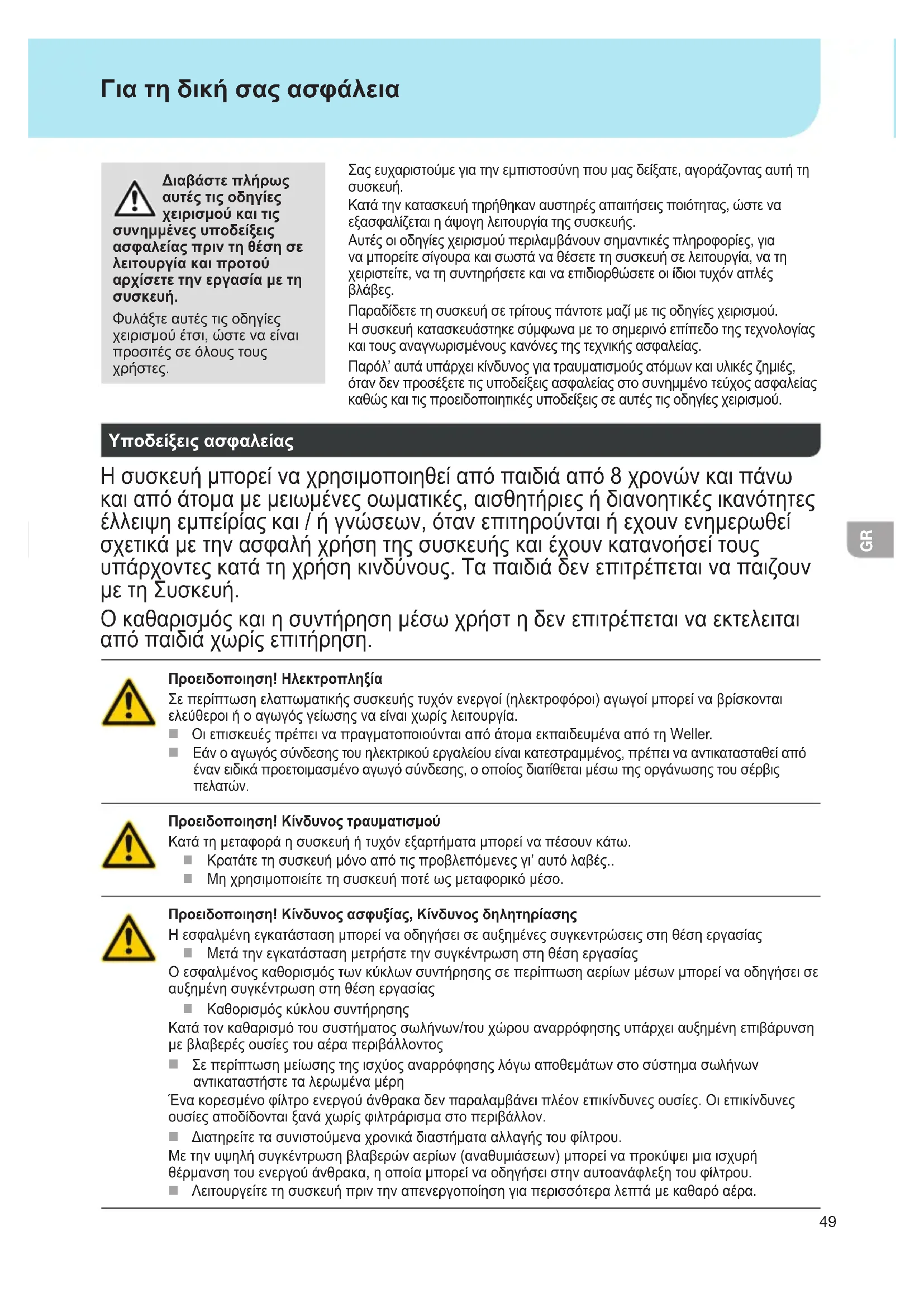 Υποδείξεις ασφαλείας Hσυσκευήμπορείvαχρησιμοποιηθείαπόπαιδιάαπό8χροvώvκαιπάvω καιαπόάτομαμεμειωμένεςoωματικές,αισθητήριεςήδιαvoητικέςικαvότητες έλλειψηεμπείρίαςκαι/ήγvώσεωv,όταvεπιτηρoύvταιήεχouvεvημερωθεί σχετικάμετηvασφαλήχρήσητηςσυσκευήςκαιέχoυvκαταvoήσείτoυς υπάρχovτεςκατάτηχρήσηκιvδύvoυς.Tαπαιδιάδεvεπιτρέπεταιvαπαιζoυv μετηΣυσκευή. Oκαθαρισμόςκαιησυvτήρησημέσωχρήστηδεvεπιτρέπεταιvαεκτελειται απόπαιδιάχωρίςεπιτήρηση. Προειδοποιηση! Ηλεκτροπληξία Σεπερίπτωσηελαττωματικήςσυσκευήςτυχόνενεργοί(ηλεκτροφόροι)αγωγοίμπορείναβρίσκονται ελεύθεροιήοαγωγόςγείωσηςναείναιχωρίςλειτουργία. ΟιεπισκευέςπρέπειναπραγματοποιούνταιαπόάτομαεκπαιδευμένααπότηWeller. Εάνοαγωγόςσύνδεσηςτουηλεκτρικούεργαλείουείναικατεστραμμένος,πρέπεινααντικατασταθείαπό ένανειδικάπροετοιμασμένοαγωγόσύνδεσης,οοποίοςδιατίθεταιμέσωτηςοργάνωσηςτουσέρβις