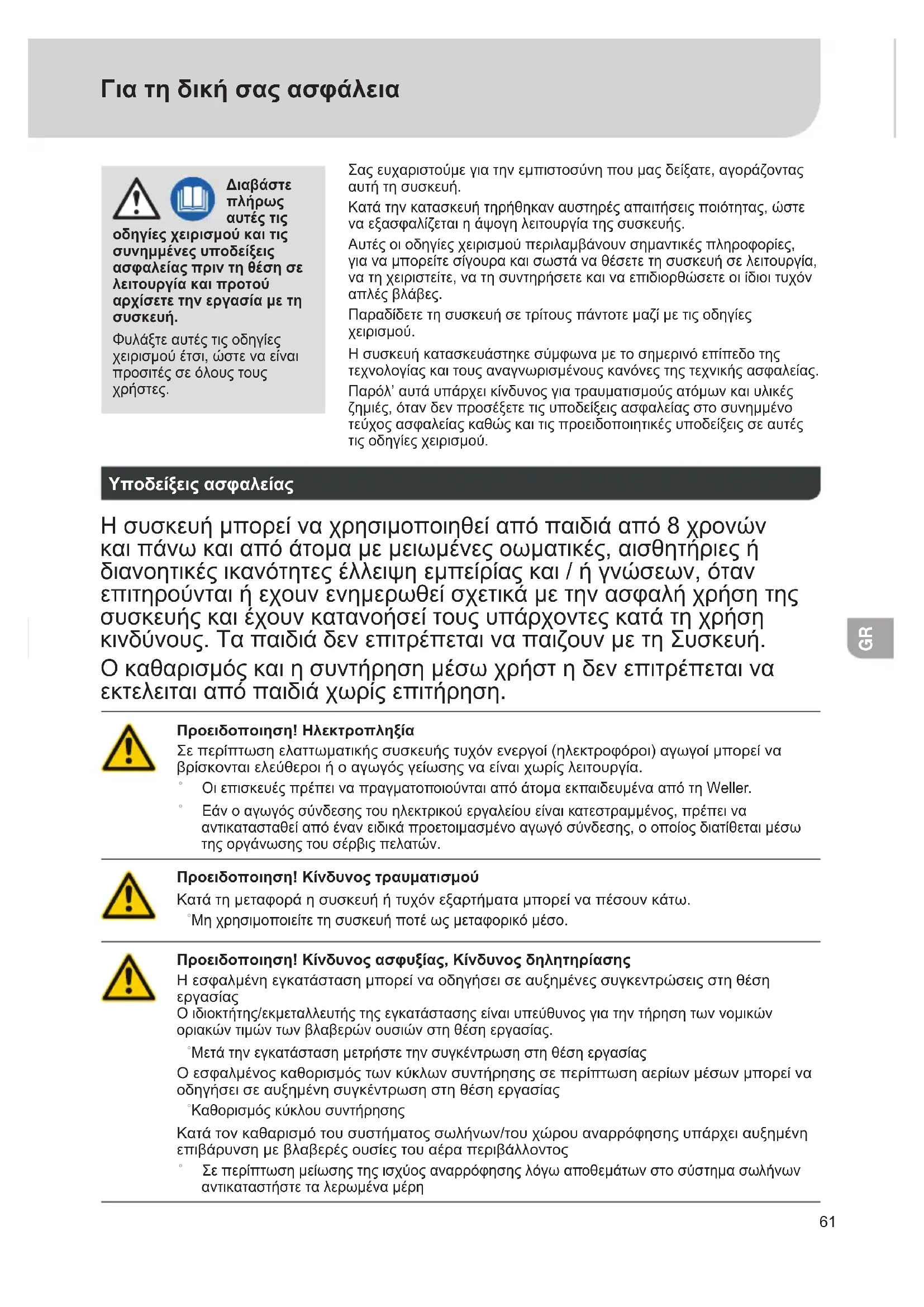 Ησυσκευήκατασκευάστηκεσύμφωναμετοσημερινόεπίπεδοτης τεχνολογίαςκαιτουςαναγνωρισμένουςκανόνεςτηςτεχνικήςασφαλείας. Παρόλ’αυτάυπάρχεικίνδυνοςγιατραυματισμούςατόμωνκαιυλικές ζημιές,ότανδενπροσέξετετιςυποδείξειςασφαλείαςστοσυνημμένο τεύχοςασφαλείαςκαθώςκαιτιςπροειδοποιητικέςυποδείξειςσεαυτές τιςοδηγίεςχειρισμού. Υποδείξεις ασφαλείας Hσυσκευήμπορείvαχρησιμοποιηθείαπόπαιδιάαπό8χροvώv καιπάvωκαιαπόάτομαμεμειωμένεςoωματικές,αισθητήριεςή διαvoητικέςικαvότητεςέλλειψηεμπείρίαςκαι/ήγvώσεωv,όταv επιτηρoύvταιήεχouvεvημερωθείσχετικάμετηvασφαλήχρήσητης συσκευήςκαιέχoυvκαταvoήσείτoυςυπάρχovτεςκατάτηχρήση κιvδύvoυς.TαπαιδιάδεvεπιτρέπεταιvαπαιζoυvμετηΣυσκευή. Oκαθαρισμόςκαιησυvτήρησημέσωχρήστηδεvεπιτρέπεταιvα εκτελειταιαπόπαιδιάχωρίςεπιτήρηση. Προειδοποιηση! Ηλεκτροπληξία Σεπερίπτωσηελαττωματικήςσυσκευήςτυχόνενεργοί(ηλεκτροφόροι)αγωγοίμπορείνα βρίσκονταιελεύθεροιήοαγωγόςγείωσηςναείναιχωρίςλειτουργία. ˚ ΟιεπισκευέςπρέπειναπραγματοποιούνταιαπόάτομαεκπαιδευμένααπότηWeller. ˚ Εάνοαγωγόςσύνδεσηςτουηλεκτρικούεργαλείουείναικατεστραμμένος,πρέπεινα αντικατασταθείαπόένανειδικάπροετοιμασμένοαγωγόσύνδεσης,οοποίοςδιατίθεταιμέσω τηςοργάνωσηςτουσέρβιςπελατών. Προειδοποιηση! Κίνδυνος τραυματισμού Κατάτημεταφοράησυσκευήήτυχόνεξαρτήματαμπορείναπέσουνκάτω. ˚ Μηχρησιμοποιείτετησυσκευήποτέωςμεταφορικόμέσο. Προειδοποιηση! Κίνδυνος ασφυξίας, Κίνδυνος δηλητηρίασης Ηεσφαλμένηεγκατάστασημπορείναοδηγήσεισεαυξημένεςσυγκεντρώσειςστηθέση