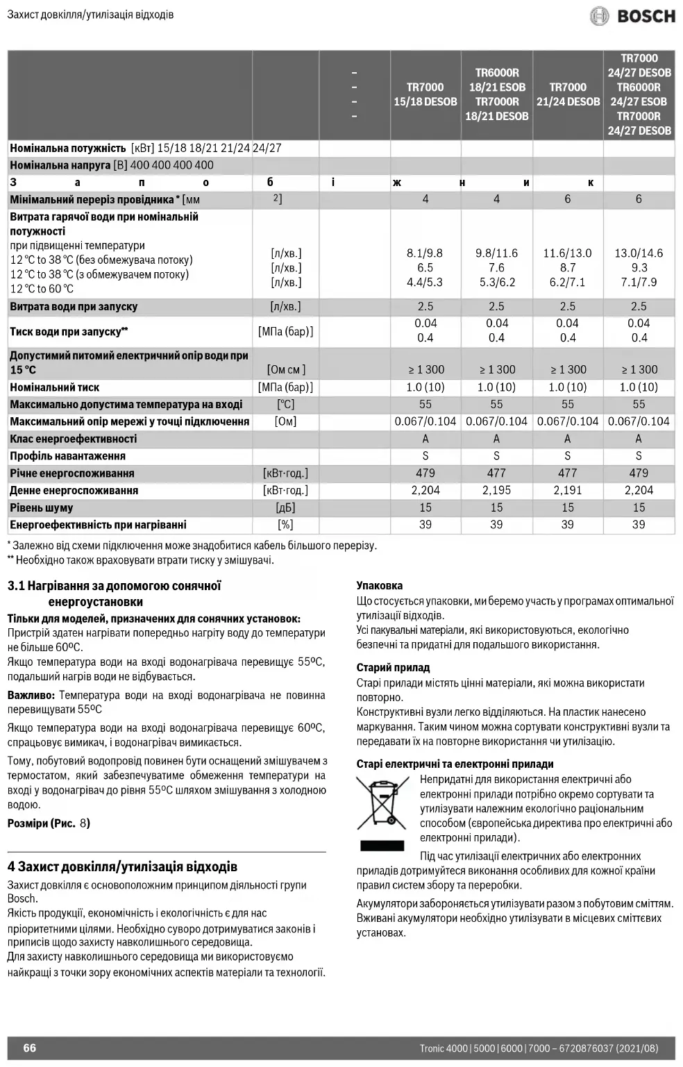 - Μόνο για συσκευές, που είναι κατάλληλες για λειτουργία ηλιακού: Προμείκτης με θερμοστάτη για τοποθέτηση σε οικιακή εγκατάσταση με χρήση προθερμασμένου νερού. 5 Προστασία του περιβάλλοντος και απόρριψη Η προστασία του περιβάλλοντος αποτελεί θεμελιώδη αρχή του ομίλου Bosch. Η ποιότητα των προϊόντων, η αποδοτικότητα και η προστασία του περιβάλλοντος αποτελούν για εμάς στόχους ίδιας βαρύτητας. Οι νόμοι και κανονισμοί για την προστασία του περιβάλλοντος τηρούνται αυστηρά. Για να προστατεύσουμε το περιβάλλον χρησιμοποιούμε τη βέλτιστη τεχνολογία και τα καλύτερα υλικά, λαμβάνοντας πάντα υπόψη μας τους παράγοντες για την καλύτερη αποδοτικότητα.