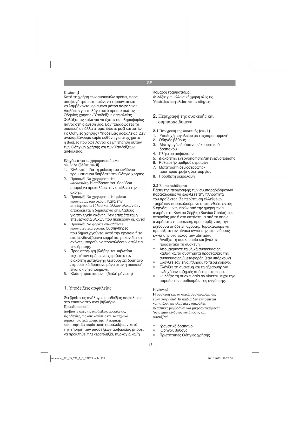 Υπολειπόμενοι κίνδυνοι Aκόμη και σε περίπτωση σωστής και κανονικής χρήσης αυτού του ηλεκτρικού εργαλείου, υφίστανται πάντα ορισμένοι υπολειπόμενοι κίνδυνοι. Oι ακόλουθοι κίνδυνοι μπορούν να παρουσιαστούν ανάλογα με το είδος κατασκευής και το Anleitung_TC_ID_720_1_E_SPK13.indb 119Anleitung_TC_ID_720_1_E_SPK13.indb 119 26.10.2023 16:23:5526.10.2023 16:23:55GR