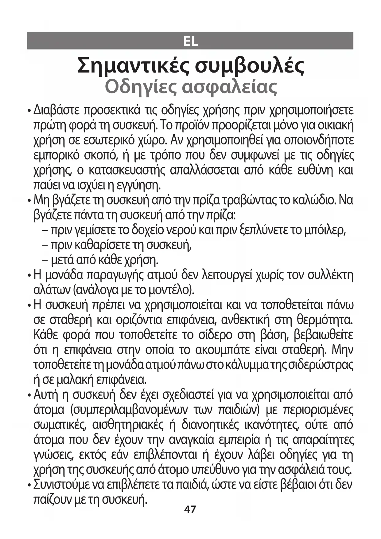 - Διαβάστε προσεκτικά τις οδηγίες χρήσης πριν χρησιμοποιήσετε πρώτη φορά τη συσκευή. Το προϊόν προορίζεται μόνο για οικιακή χρήση σε εσωτερικό χώρο. Αν χρησιμοποιηθεί για οποιονδήποτε εμπορικό σκοπό, ή με τρόπο που δεν συμφωνεί με τις οδηγίες χρήσης, ο κατασκευαστής απαλλάσσεται από κάθε ευθύνη και παύει να ισχύει η εγγύηση.