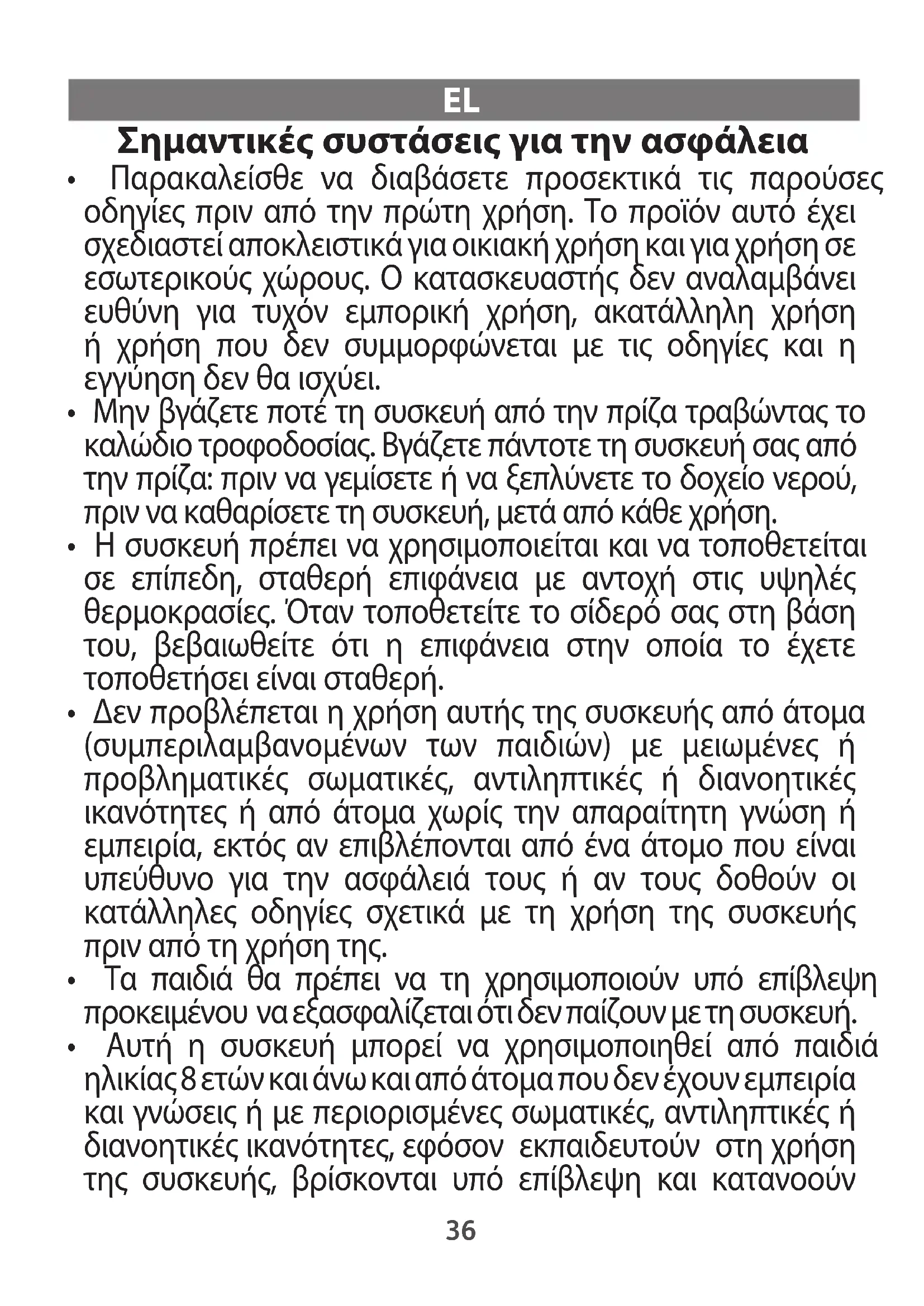 - Δεν προβλέπεται η χρήση αυτής της συσκευής από άτομα (συμπεριλαμβανομένων των παιδιών) με μειωμένες ή προβληματικές σωματικές, αντιληπτικές ή διανοητικές ικανότητες ή από άτομα χωρίς την απαραίτητη γνώση ή εμπειρία, εκτός αν επιβλέπονται από ένα άτομο που είναι υπεύθυνο για την ασφάλειά τους ή αν τους δοθούν οι κατάλληλες οδηγίες σχετικά με τη χρήση της συσκευής πριν από τη χρήση της.