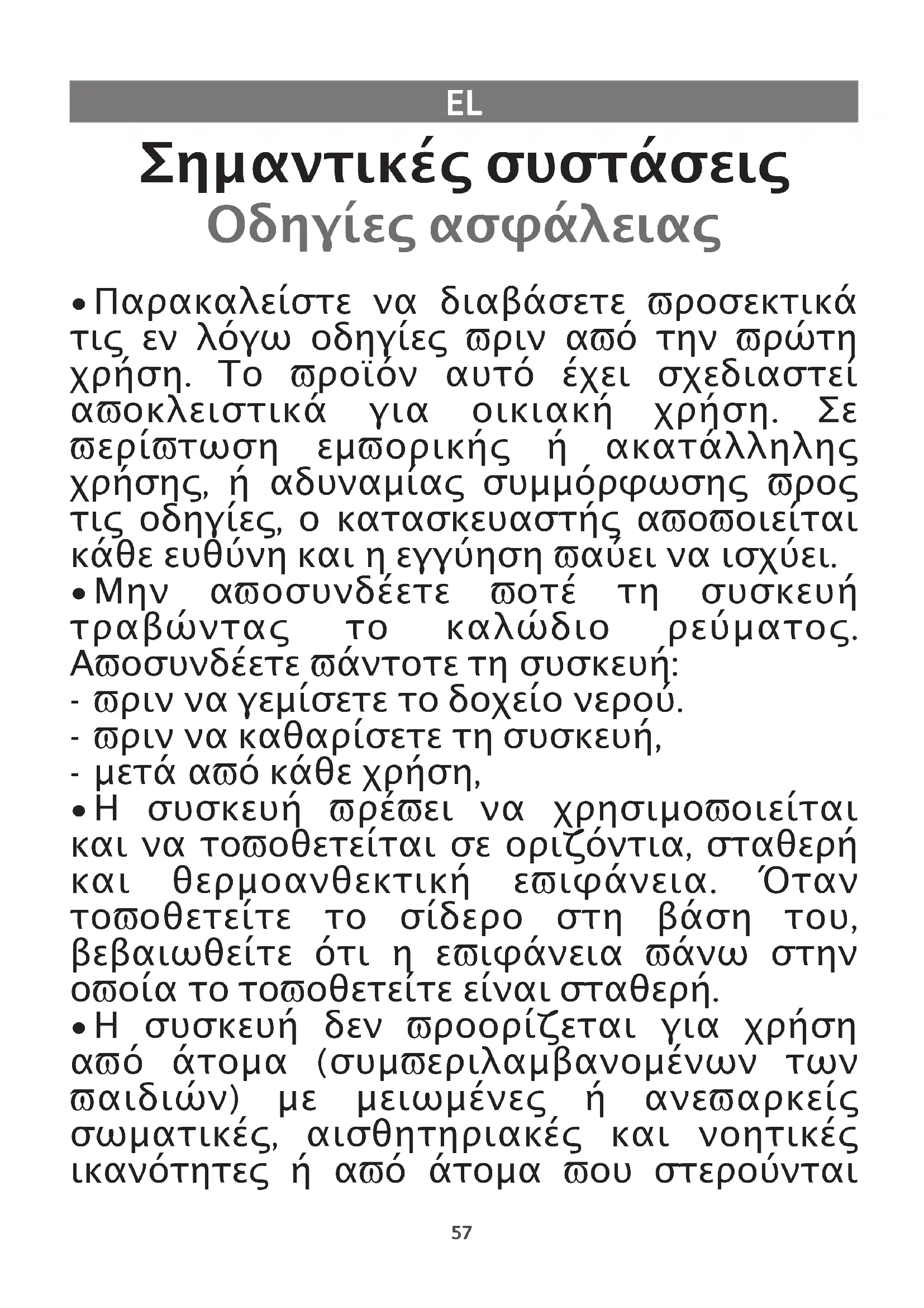 - Ελέγχετε το καλώδιο ρεύματος και ατμού για ενδείξεις φθοράς ή βλάβης πριν από τη χρήση. Εάν το καλώδιο ρεύματος ή το καλώδιο σύνδεσης με νερό έχουν φθαρεί, πρέπει να αντικατασταθούν από εξουσιοδοτημένο κέντρο επισκευής για την αποφυγή κινδύνων.60