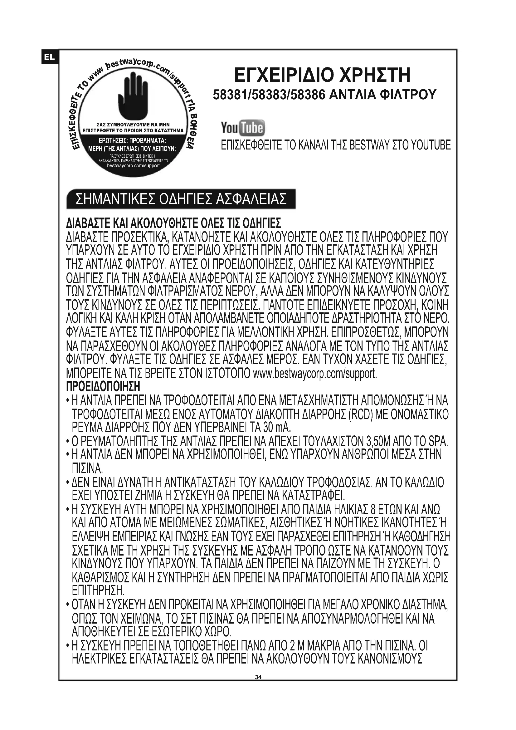 ΕΠΙΣΚΕΦΘΕΙΤΕ ΤΟ ΚΑΝΑΛΙ ΤΗΣ BESTWAY ΣΤΟ YOUTUBE ΕΓΧΕΙΡΙΔΙΟ ΧΡΗΣΤΗ 58381/58383/58386 ΑΝΤΛΙΑ ΦΙΛΤΡΟΥ ΔΙΑΒΑΣΤΕ ΚΑΙ ΑΚΟΛΟΥΘΗΣΤΕ ΟΛΕΣ ΤΙΣ ΟΔΗΓΙΕΣ ΔΙΑΒΑΣΤΕ ΠΡΟΣΕΚΤΙΚΑ, ΚΑΤΑΝΟΗΣΤΕ ΚΑΙ ΑΚΟΛΟΥΘΗΣΤΕ ΟΛΕΣ ΤΙΣ ΠΛΗΡΟΦΟΡΙΕΣ ΠΟΥ ΥΠΑΡΧΟΥΝ ΣΕ ΑΥΤΟ ΤΟ ΕΓΧΕΙΡΙΔΙΟ ΧΡΗΣΤΗ ΠΡΙΝ ΑΠΟ ΤΗΝ ΕΓΚΑΤΑΣΤΑΣΗ ΚΑΙ ΧΡΗΣΗ ΤΗΣ ΑΝΤΛΙΑΣ ΦΙΛΤΡΟΥ. ΑΥΤΕΣ ΟΙ ΠΡΟΕΙΔΟΠΟΙΗΣΕΙΣ, ΟΔΗΓΙΕΣ ΚΑΙ ΚΑΤΕΥΘΥΝΤΗΡΙΕΣ ΟΔΗΓΙΕΣ ΓΙΑ ΤΗΝ ΑΣΦΑΛΕΙΑ ΑΝΑΦΕΡΟΝΤΑΙ ΣΕ ΚΑΠΟΙΟΥΣ ΣΥΝΗΘΙΣΜΕΝΟΥΣ ΚΙΝΔΥΝΟΥΣ ΤΩΝ ΣΥΣΤΗΜΑΤΩΝ ΦΙΛΤΡΑΡΙΣΜΑΤΟΣ ΝΕΡΟΥ, ΑΛΛΑ ΔΕΝ ΜΠΟΡΟΥΝ ΝΑ ΚΑΛΥΨΟΥΝ ΟΛΟΥΣ ΤΟΥΣ ΚΙΝΔΥΝΟΥΣ ΣΕ ΟΛΕΣ ΤΙΣ ΠΕΡΙΠΤΩΣΕΙΣ. ΠΑΝΤΟΤΕ ΕΠΙΔΕΙΚΝΥΕΤΕ ΠΡΟΣΟΧΗ, ΚΟΙΝΗ ΛΟΓΙΚΗ ΚΑΙ ΚΑΛΗ ΚΡΙΣΗ ΟΤΑΝ ΑΠΟΛΑΜΒΑΝΕΤΕ ΟΠΟΙΑΔΗΠΟΤΕ ΔΡΑΣΤΗΡΙΟΤΗΤΑ ΣΤΟ ΝΕΡΟ. ΦΥΛΑΞΤΕ ΑΥΤΕΣ ΤΙΣ ΠΛΗΡΟΦΟΡΙΕΣ ΓΙΑ ΜΕΛΛΟΝΤΙΚΗ ΧΡΗΣΗ. ΕΠΙΠΡΟΣΘΕΤΩΣ, ΜΠΟΡΟΥΝ ΝΑ ΠΑΡΑΣΧΕΘΟΥΝ ΟΙ ΑΚΟΛΟΥΘΕΣ ΠΛΗΡΟΦΟΡΙΕΣ ΑΝΑΛΟΓΑ ΜΕ ΤΟΝ ΤΥΠΟ ΤΗΣ ΑΝΤΛΙΑΣ ΦΙΛΤΡΟΥ. ΦΥΛΑΞΤΕ ΤΙΣ ΟΔΗΓΙΕΣ ΣΕ ΑΣΦΑΛΕΣ ΜΕΡΟΣ. ΕΑΝ ΤΥΧΟΝ ΧΑΣΕΤΕ ΤΙΣ ΟΔΗΓΙΕΣ, ΜΠΟΡΕΙΤΕ ΝΑ ΤΙΣ ΒΡΕΙΤΕ ΣΤΟΝ ΙΣΤΟΤΟΠΟ www.bestwaycorp.com/support. ΠΡΟΕΙΔΟΠΟΙΗΣΗ