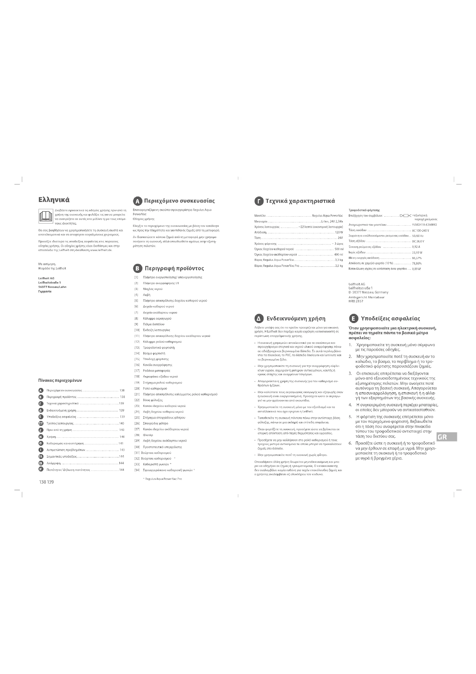 Διαβάστε προσεκτικά τις οδηγίες χρήσης πριν από τη χρήση της συσκευής και φυλάξτε τις για να μπορείτε να ανατρέξετε σε αυτές στο μέλλον ή για τους επόμε-νους ιδιοκτήτες. Θα σας βοηθήσουν να χρησιμοποιήσετε τη συσκευή σωστά και αποτελεσματικά και να αποφύγετε εσφαλμένους χειρισμούς.Προσέξτε ιδιαίτερα τις υποδείξεις ασφαλείας στις παρούσες οδηγίες χρήσης. Οι οδηγίες χρήσης είναι διαθέσιμες και στην ιστοσελίδα της Leifheit στη διεύθυνση www.leifheit.de.Με εκτίμηση, Η ομάδα της LeifheitLeifheit AG Leifheitstraße 1 56377 Nassau/Lahn Γερμανία Πίνακας περιεχομένων