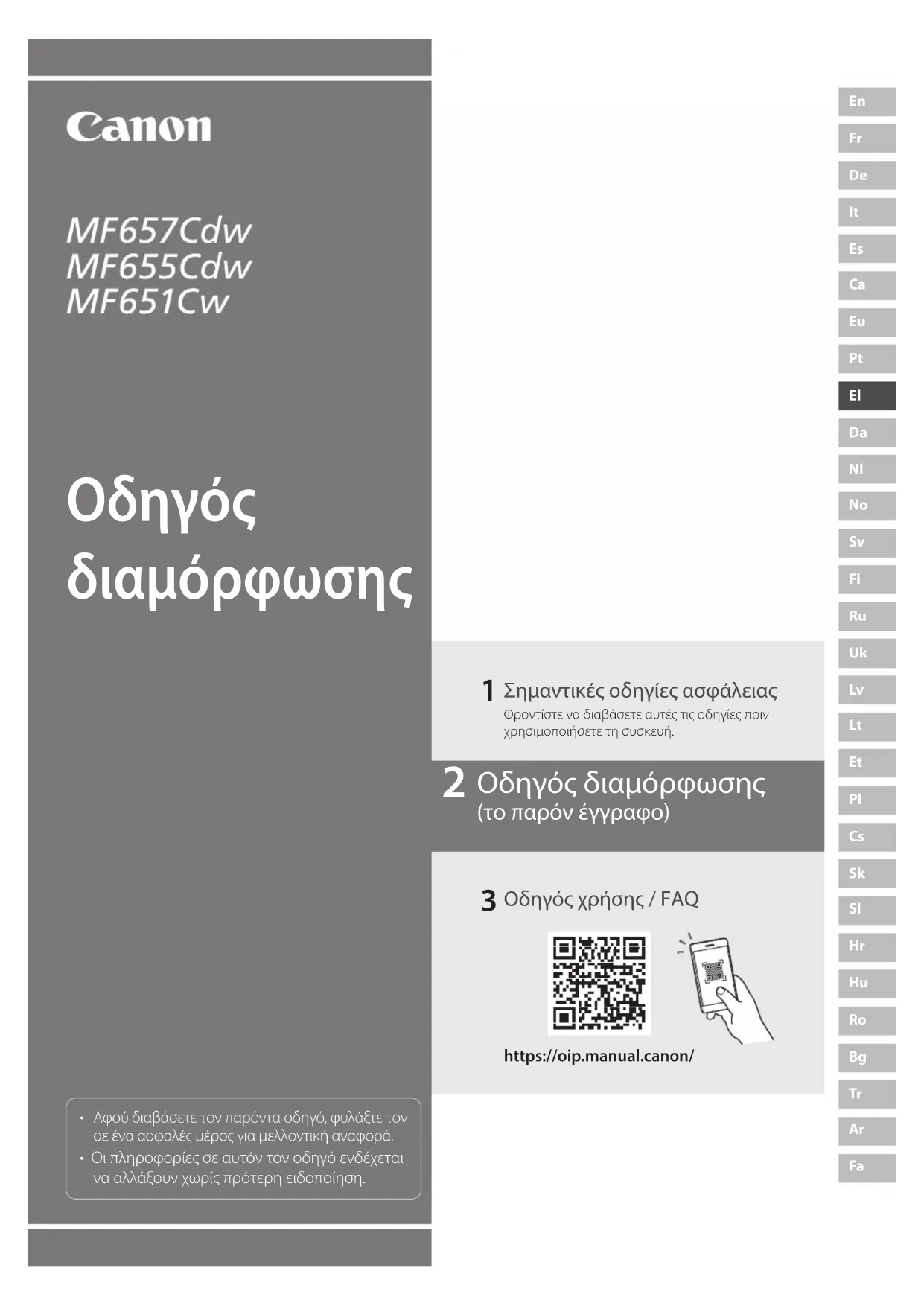Αφού διαβάσετε τον παρόντα οδηγό, φυλάξτε τον σε ένα ασφαλές μέρος για μελλοντική αναφορά.• Οι πληροφορίες σε αυτόν τον οδηγό ενδέχεται να αλλάξουν χωρίς πρότερη ειδοποίηση.https://oip.manual.canon/ Σημαντικές οδηγίες ασφάλειαςΦροντίστε να διαβάσετε αυτές τις οδηγίες πριν χρησιμοποιήσετε τη συσκευή. Οδηγός χρήσης / FAQ