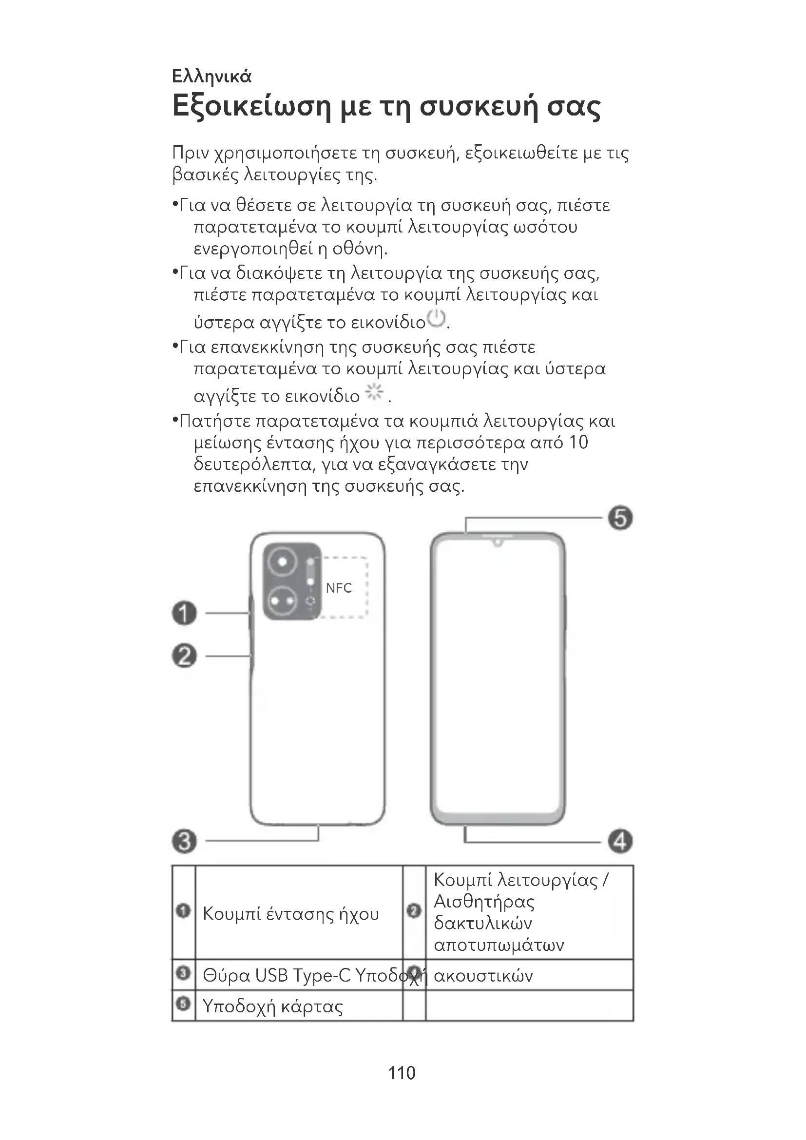 αποτυπωμάτων Θύρα USB Type-C Υποδοχή ακουστικών Υποδοχή κάρτας 110• Κατά τη χρήση της λειτουργίας NFC πρέπει να φέρνετε και να κρατάτε την περιοχή NFC κοντά σε άλλες συσκευές ή άλλα αντικείμενα.