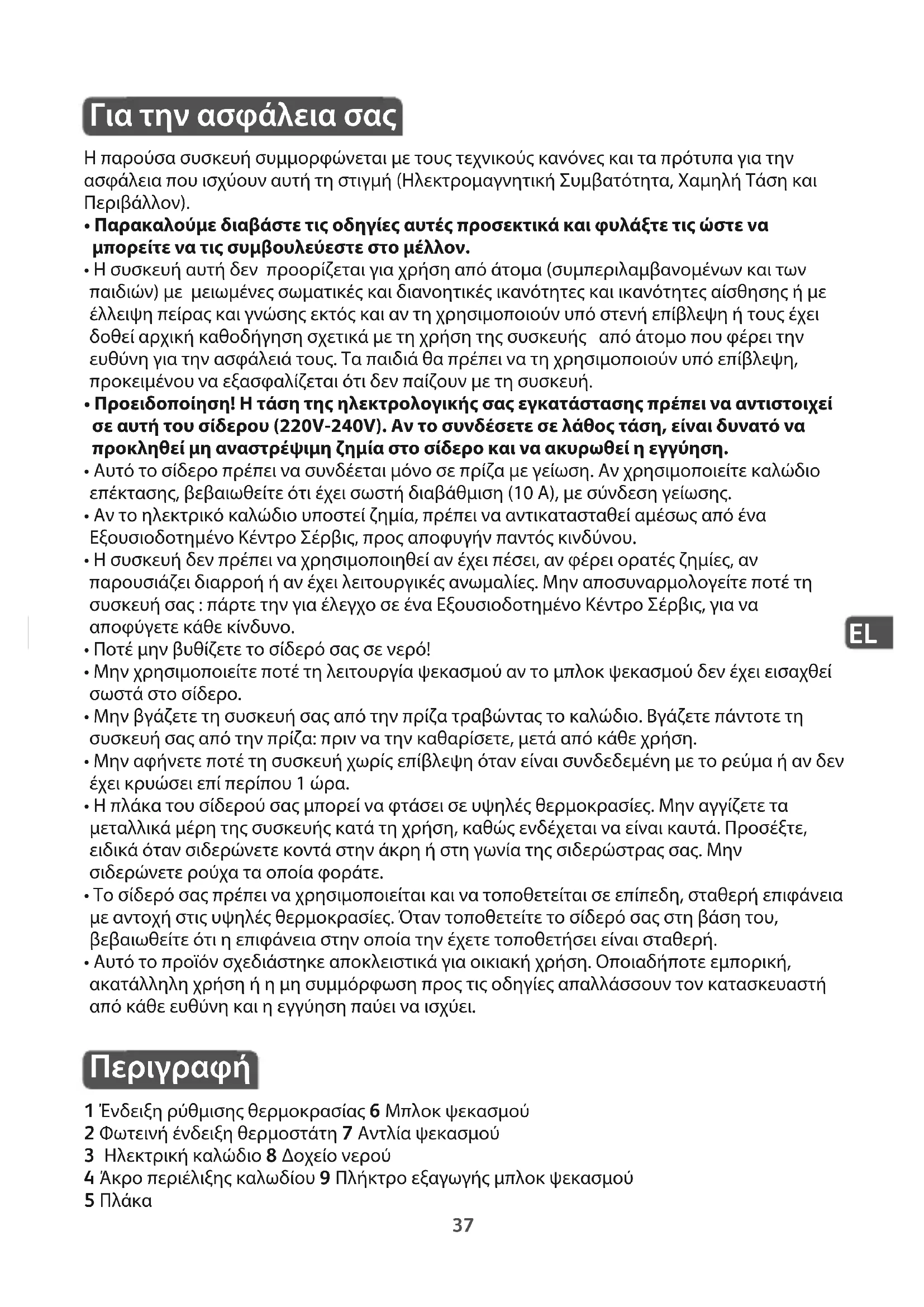 - Αυτό το σίδερο πρέπει να συνδέεται μόνο σε πρίζα με γείωση. Αν χρησιμοποιείτε καλώδιο επέκτασης, βεβαιωθείτε ότι έχει σωστή διαβάθμιση (10 A), με σύνδεση γείωσης.