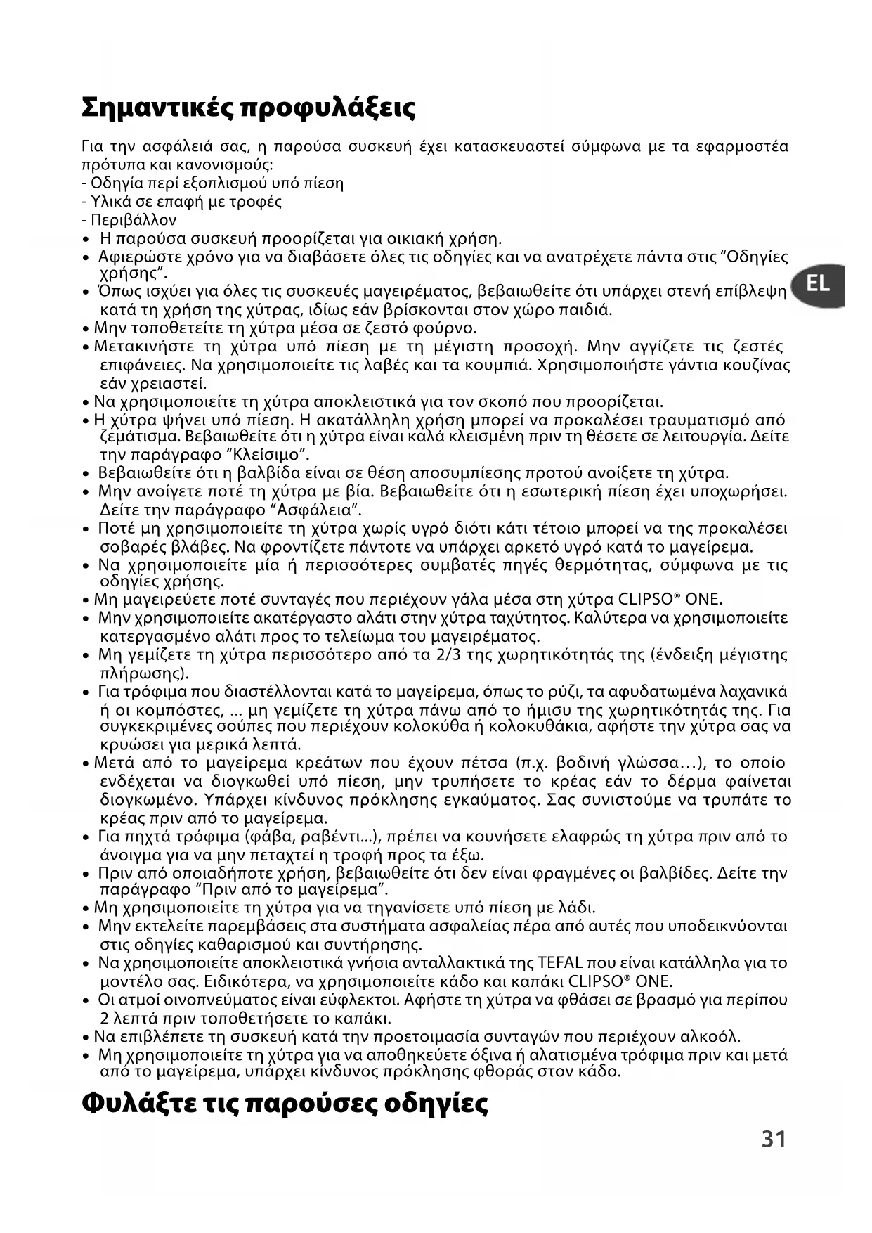 Εάν μετά από τον έλεγχο και τον καθαρισμό, η χύτρα παρουσιάζει διαρροήή δεν λειτουργεί η χύτρα, προσκομίστε τη σε ένα εξουσιοδοτημένο κέντροσέρβις της TEFAL. Συμβουλές χρήσης 1 - Ο ατμός είναι υπερβολικά ζεστός όταν βγαίνει από τη βαλβίδαλειτουργίας.2 - Όταν αρχίσει να ανεβαίνει η ένδειξη παρουσίας πίεσης, δενμπορείτε πλέον να ανοίξετε τη χύτρα.3 - Όπως ισχύει για όλες τις συσκευές μαγειρέματος, βεβαιωθείτε ότιυπάρχει στενή επίβλεψη κατά τη χρήση της χύτρας εάνβρίσκονται στον χώρο παιδιά.4 - Να είστε προσεκτικοί ως προς τις εκτινάξεις ατμού.5 - Για να μετακινήσετε τη χύτρα, κρατήστε την από τις δύο λαβές τουκάδου.6 - Μην αφήνετε τις τροφές για μεγάλο χρονικό διάστημα μέσα στηχύτρα.7 - Ποτέ μη χρησιμοποιείτε χλωρίνη ή χλωριωμένα προϊόντα, γιατίμπορεί να αλλοιωθεί η ποιότητα του ανοξείδωτου χάλυβα.8 - Μην αφήνετε το καπάκι να μουλιάσει σε νερό.9 - Αντικαταστήστε τον σύνδεσμο στεγανοποίησης μία φορά ανάέτος.10 - Ο καθαρισμός της χύτρας γίνεται αποκλειστικά αφού έχεικρυώσει και είναι άδεια.11 - Πρέπει οπωσδήποτε να προσκομίσετε τη χύτρα για έλεγχο σε έναεξουσιοδοτημένο κέντρο σέρβις της TEFAL μετά από 10 χρόνιαχρήσης. TE_CLIPSO-ONE_4137343_IFU-TEFAL-CLIPSO ONE 05/11/12 10:19 Page3738