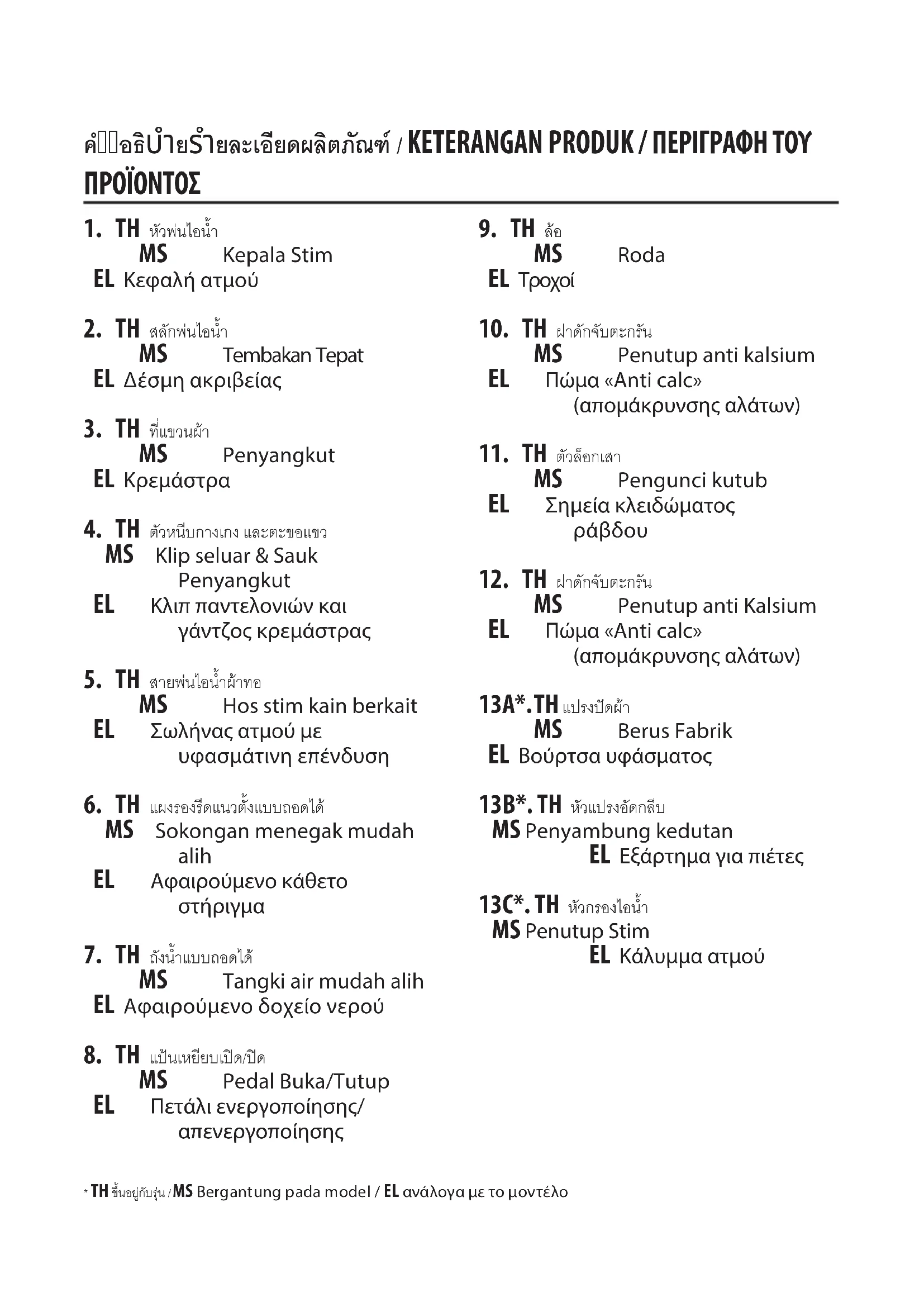 MS Penutup anti Kalsium EL Πώμα «Anti calc» (απομάκρυνσης αλάτων) 13A*. TH MS Berus Fabrik EL Βούρτσα υφάσματος 13B*. TH MS Penyambung kedutan EL Εξάρτημα για πιέτες 13C*. TH MS Penutup Stim EL Κάλυμμα ατμού