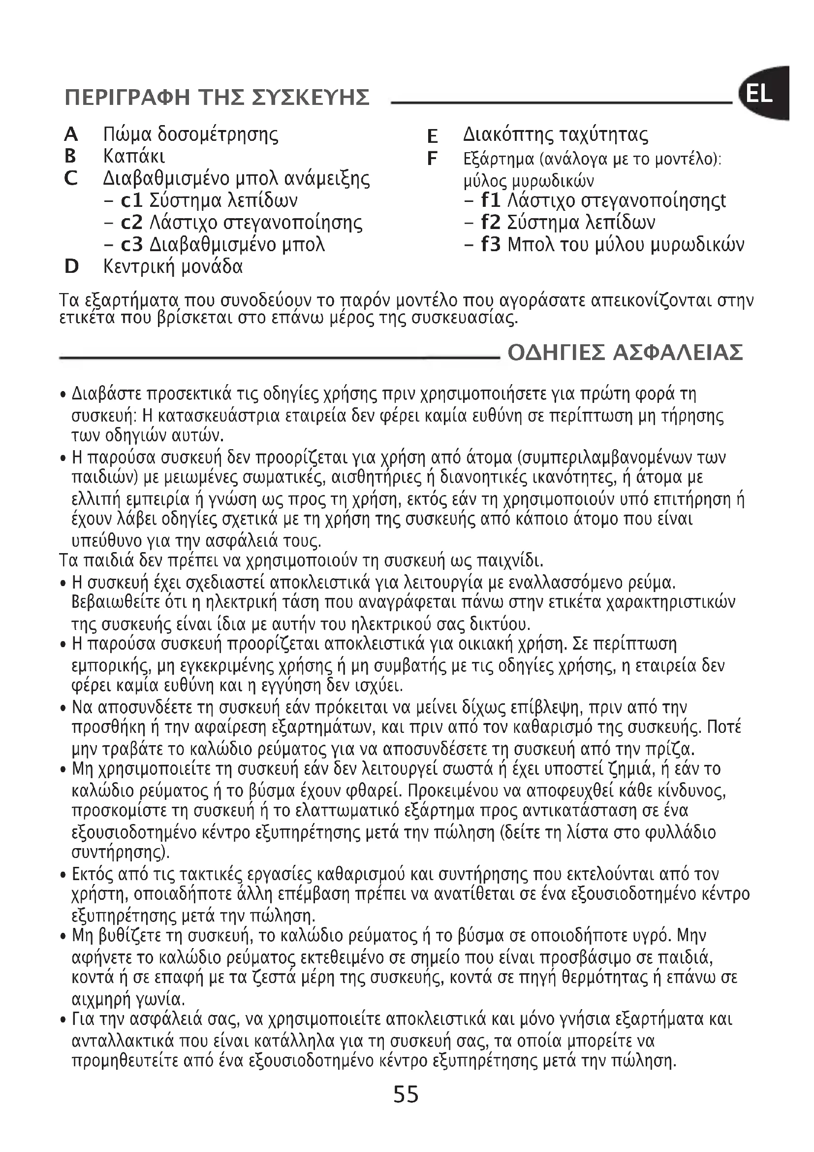 Διακόπτης ταχύτητας Εξάρτημα (ανάλογα με το μοντέλο):μύλος μυρωδικών - f1 Λάστιχο στεγανοποίησηςt - f2 Σύστημα λεπίδων - f3 Μπολ του μύλου μυρωδικών ΠΕΡΙΓΡΑΦΗ ΤΗΣ ΣΥΣΚΕΥΗΣ Τα εξαρτήματα που συνοδεύουν το παρόν μοντέλο που αγοράσατε απεικονίζονται στηνετικέτα που βρίσκεται στο επάνω μέρος της συσκευασίας. ΟΔΗΓΙΕΣ ΑΣΦΑΛΕΙΑΣ