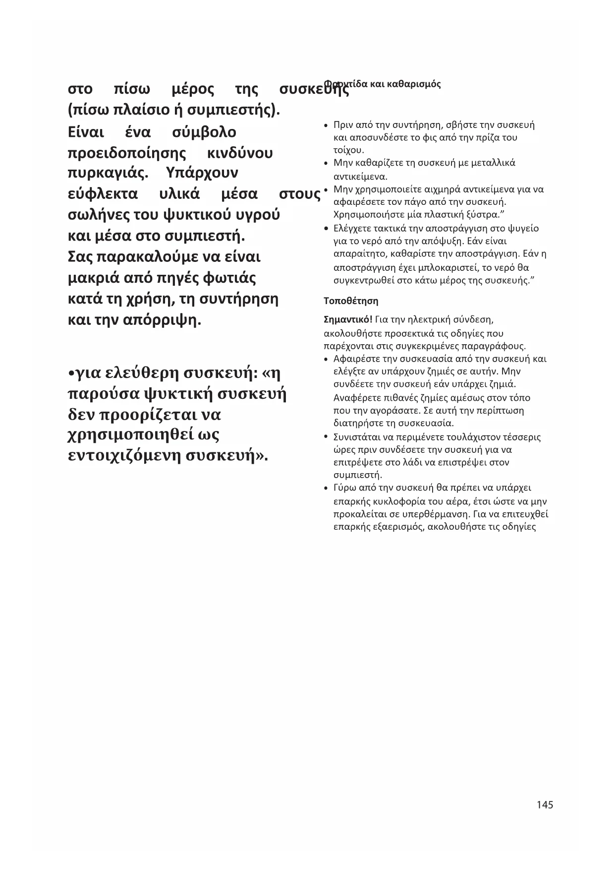 Ʌʌʉʍʏɲʍʀɲʏʉʐʋɸʌɿɴɳʄʄʉʆʏʉʎ ® Η συσκευή αυτή δεν περιέχει αέρια που θα μπορούσαν να βλάψουν τη στιβάδα του όζοντος, είτε στο κύκλωμα του ψυκτικού αέριου είτε στα μονωτικά υλικά. Η συσκευή δεν απορρίπτεται μαζί με τα αστικά απορρίμματα και τα σκουπίδια. Ο αφρός της μόνωσης περιέχει εύφλεκτα αέρια· η συσκευή θα πρέπει να απορριφθεί σύμφωνα με τους κανονισμούς της συσκευής για να παραληφθεί από τις τοπικές αρχές. Αποφύγετε την καταστροφή της μονάδας ψύξης, ειδικά του εναλλάκτη θερμότητας. Τα υλικά που χρησιμοποιούνται σε αυτή τη συσκευή και φέρουν το σύμβολο Α είναι ανακυκλώσιμα. Το σύμβολο Κ επάνω στο προϊόν ή στην συσκευασία του υποδεικνύει ότι το αυτό προϊόν δεν θα πρέπει να αντιμετωπίζεται σαν οικιακό απόρριμμα. Αντίθετα, θα πρέπει να μεταφέρεται στο κατάλληλο σημείο συλλογής για την ανακύκλωση ηλεκτρικού και ηλεκτρονικού εξοπλισμού. Εξασφαλίζοντας ότι αυτό το προϊόν απορρίπτεται σωστά, θα βοηθήσετε στην πρόληψη δυνητικών αρνητικών επιπτώσεων για το περιβάλλον, οι οποίες θα μπορούσαν σε αντίθετη περίπτωση να προκληθούν από την ακατάλληλη διαχείριση απόρριψης αυτού του προϊόντος. Για ποιο αναλυτικές πληροφορίες σχετικά με την ανακύκλωση αυτού του προϊόντος, σας παρακαλούμε να επικοινωνήσετε με τον τοπικό σας σύμβουλο της υπηρεσίας απόρριψης, ή με το κατάστημα από το οποίο αγοράσατε το προϊόν. ɉʄɿʃɳʍʐʍʃɸʐɲʍʀɲʎ Τα υλικά με το σύμβολο είναι ανακυκλώσιμα. Απορρίψτε την συσκευασία μέσα σε ένα κατάλληλο κάδο συλλογής για να την ανακυκλώσετε. ΑΠΟΡΡΙΨΗ ΠΑΛΑΙΩΝ ΣΥΣΚΕΥΩΝ Αυτή η συσκευή έχει σήμανση σύμφωνα με την Ευρωπαϊκή οδηγία 2012/19/EU σχετικά με τα απόβλητα ειδών ηλεκτρικού και ηλεκτρονικού εξοπλισμού (WEEE). Τα WEEE περιέχουν τόσο ρυπογόνες ουσίες (οι οποίες μπορούν να έχουν αρνητικές επιπτώσεις στο περιβάλλον) και βασικά εξαρτήματα (τα οποία μπορούν να χρησιμοποιηθούν και πάλι). Είναι σημαντικό να υποβάλλονται τα WEEE σε συγκεκριμένες επεξεργασίες, έτσι ώστε να αφαιρούνται και να απορρίπτονται σωστά όλα τα ρυπογόνα στοιχεία, και να ανακτώνται και να ανακυκλώνονται όλα τα υλικά. Οι ιδιώτες μπορούν να διαδραματίσουν σημαντικό ρόλο στην εξασφάλιση ότι τα WEEE δεν θα γίνουν ένα περιβαλλοντολογικό ζήτημα· είναι πολύ σημαντικό να ακολουθείτε ορισμένους βασικούς