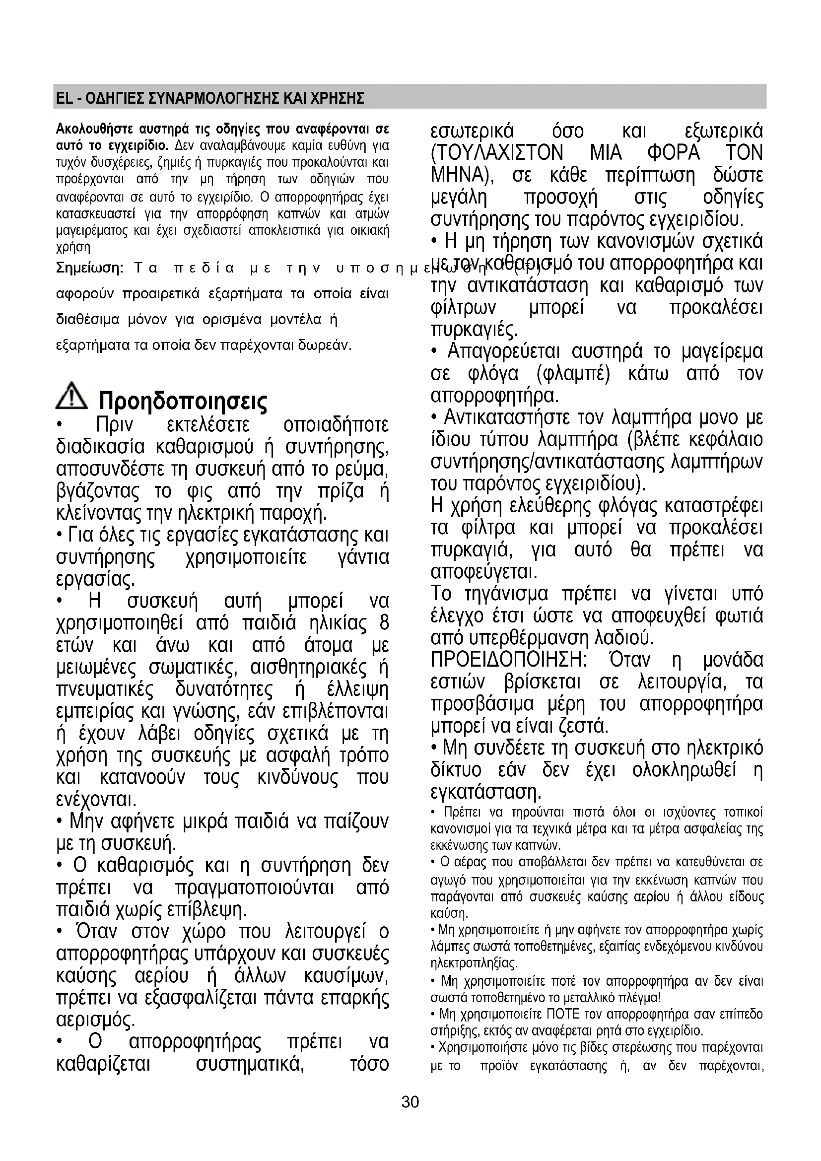 - Μη χρησιμοποιείτε ή μην αφήνετε τον απορροφητήρα χωρίς λάμπες σωστά τοποθετημένες, εξαιτίας ενδεχόμενου κινδύνου ηλεκτροπληξίας.
