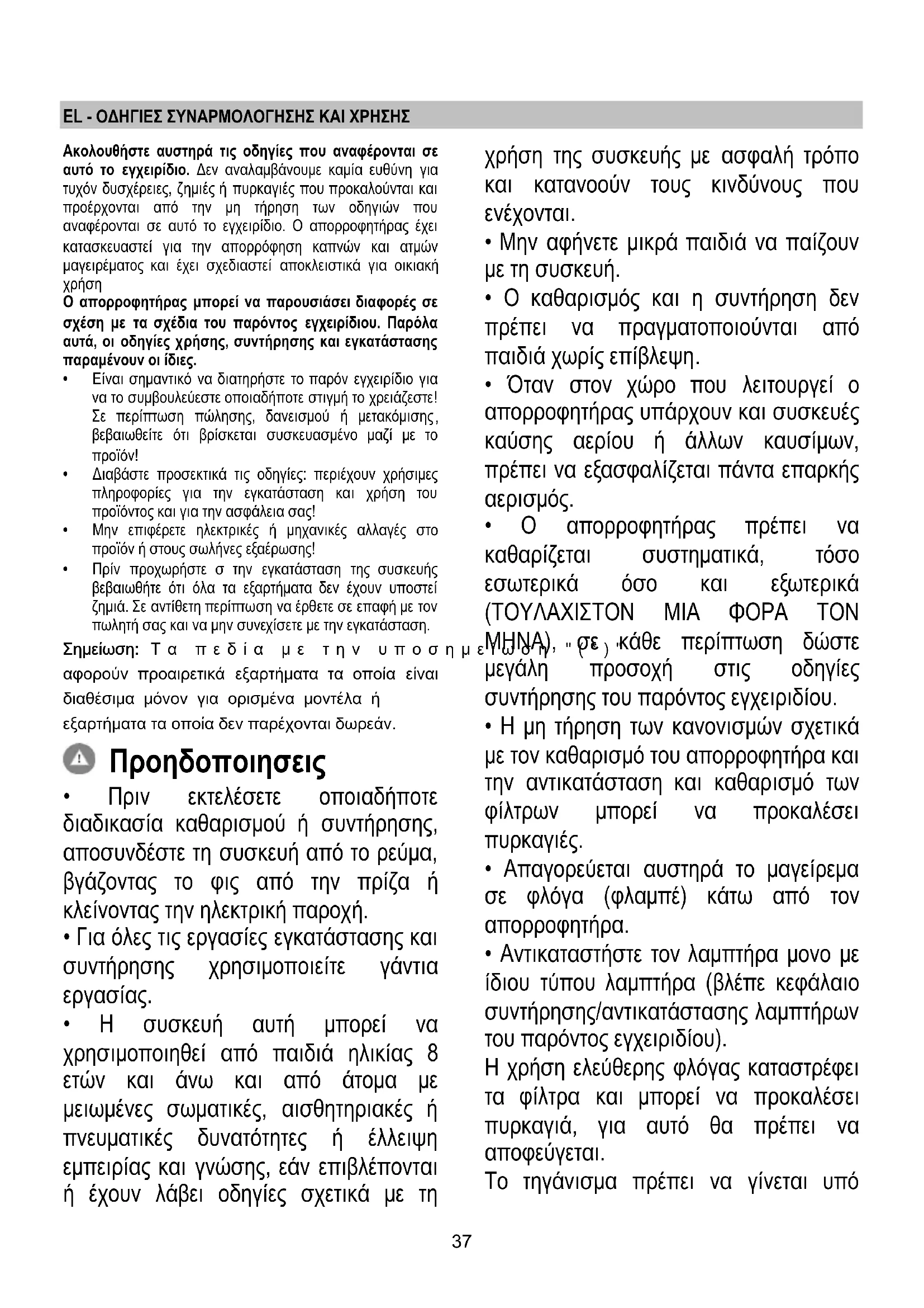 - Μη χρησιμοποιείτε ή μην αφήνετε τον απορροφητήρα χωρίς λάμπες σωστά τοποθετημένες, εξαιτίας ενδεχόμενου κινδύνου ηλεκτροπληξίας.