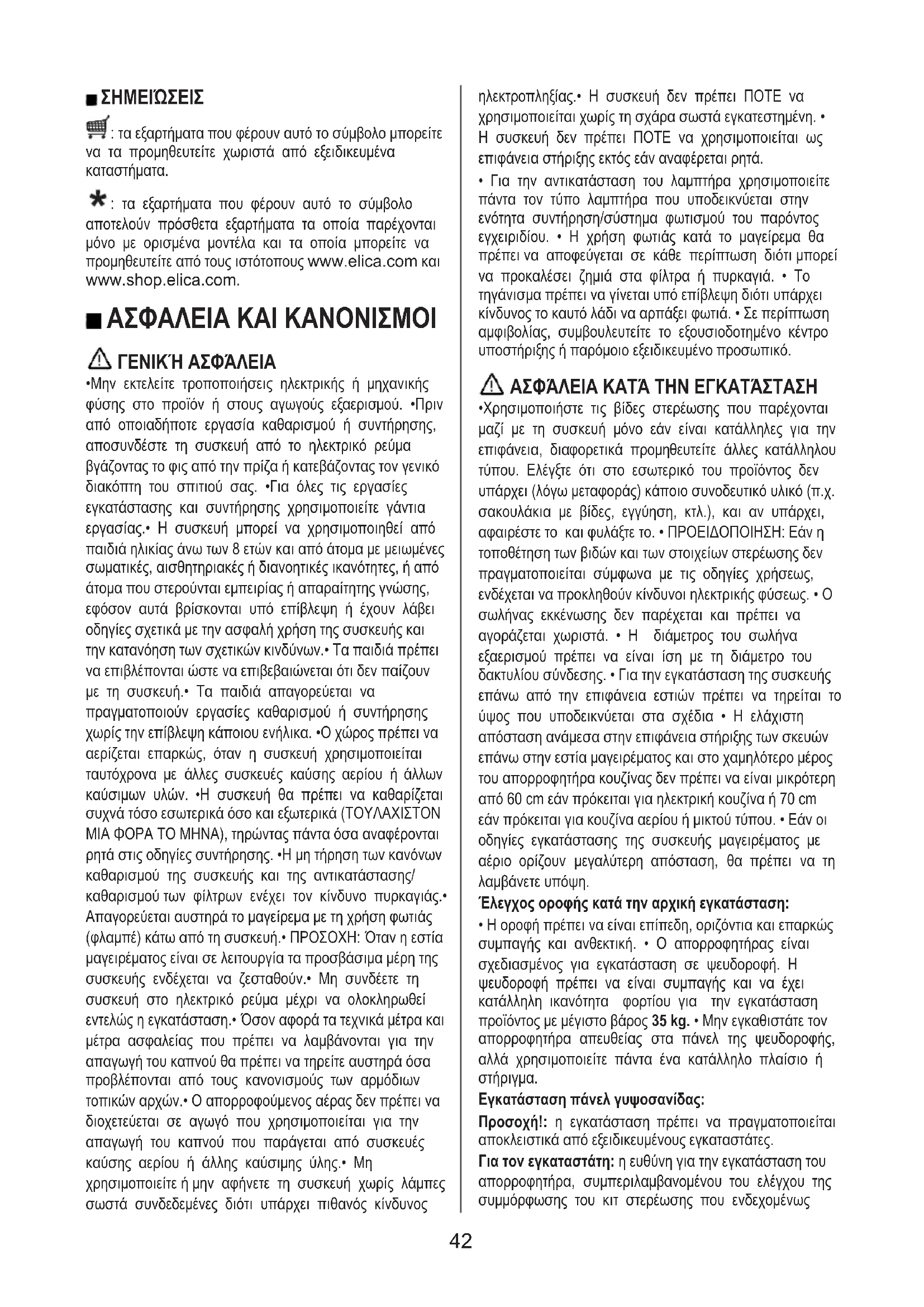 - Είναι σημαντικό να διατηρείτε όλα τα εγχειρίδια που συνοδεύουν το προϊόν ώστε να μπορείτε να τα συμβουλεύεστε ανά πάσα στιγμή. Σε περίπτωση πώλησης, μεταβίβασης ή μετεγκατάστασης, βεβαιωθείτε ότι αυτά παραμένουν μαζί με το προϊόν. • Διαβάστε προσεκτικά τις οδηγίες: υπάρχουν σημαντικές πληροφορίες σχετικά με την εγκατάσταση, τη χρήση και την ασφάλεια. • Βεβαιωθείτε ότι το προϊόν είναι ακέραιο προτού προχωρήσετε στην εγκατάσταση. Σε αντίθετη περίπτωση, επικοινωνήστε με τον πωλητή και μην εκτελείτε την εγκατάσταση. 41ΣΗΜΕΙΏΣΕΙΣ : τα εξαρτήματα που φέρουν αυτό το σύμβολο μπορείτε να τα προμηθευτείτε χωριστά από εξειδικευμένα καταστήματα. : τα εξαρτήματα που φέρουν αυτό το σύμβολο αποτελούν πρόσθετα εξαρτήματα τα οποία παρέχονται μόνο με ορισμένα μοντέλα και τα οποία μπορείτε να προμηθευτείτε από τους ιστότοπους www.elica.com και www.shop.elica.com. ΑΣΦΑΛΕΙΑ ΚΑΙ ΚΑΝΟΝΙΣΜΟΙ ΓΕΝΙΚΉ ΑΣΦΆΛΕΙΑ