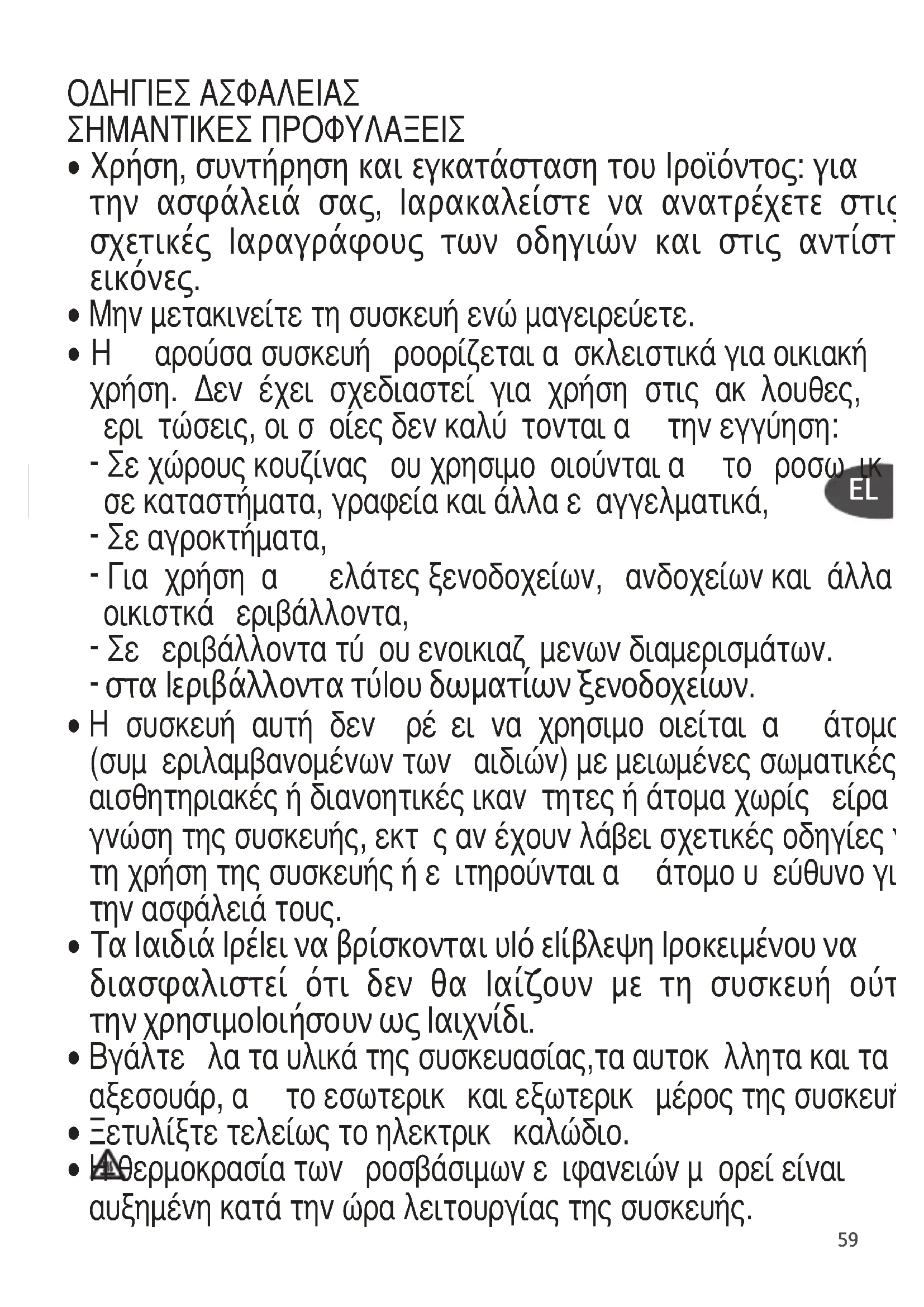- MËÓ ÙÔÔıÂÙ›Ù ÙÔ Û·Ԙ ÁÈ· ÁÈ· ¿Óˆ Û ÂÛÙ›· ·ÂÚ›Ô˘ ‹ ËÏÂÎÙÚÈ΋ Ì·ÁÂÈÚÈ΋ ÂÛÙ›· ÁÈ·Ó··ÔÊ¢¯ı› Ë ÊıÔÚ¿ Ù˜Ó Ï·‚ÒÓ. ñ ΦΟΝΤΥ ΜΕ ΛΑΔΙ: ειδικές συμβουλές ασφαλείας, χρήσης, συντήρησης και καθαρισμού για τη συγκεκριμένη λειτουργία: ñ Η συσκευή αυτή δεν πρέπει να χρησιμοποιείται από παιδιά ηλικίας από 0 έως 8 ετών. Η συσκευή αυτή μπορεί να χρησιμοποιηθεί από παιδιά ηλικίας 8 ετών και άνω εφόσον βρίσκονται υπό συνεχή επίβλεψη. Η συσκευή αυτή μπορεί να χρησιμοποιηθεί από άτομα με μειωμένες φυσικές, αισθητηριακές ή νοητικές ικανότητες ήαπό άτομα που στερούνται εμπειρίας και γνώσεων, εφόσον εποπτεύονται ή έχουν λάβει σχετικές οδηγίες ως προς τη χρήση της συσκευής κατά τρόπο πλήρως ασφαλή και εφόσον κατανοούν τους κινδύνους που διατρέχουν. Φυλάξτε τη συσκευή και το καλώδιο σε θέση, ηοποία δεν είναι προσβάσιμη σε παιδιά κάτω των 8 ετών. Ο καθαρισμός και η συντήρηση από τον χρήστη δεν πρέπει να πραγματοποιείται από παιδιά. Οι συσκευές μαγειρέματος πρέπει να βρίσκονται σε σταθερή θέση με τοποθετημένες τις λαβές (ενδεχομένως) ώστε να αποφευχθεί το ενδεχόμενο να χυθούν τα ζεστά υγρά. ñ Η συσκευή αυτή δεν είναι φριτέζα. Κατά συνέπεια αποκλείεται εντελώς η χρήση της για τηγανιτές πατάτες, λουκουμάδες (μπενιέ),… μέσα στο δοχείο.
