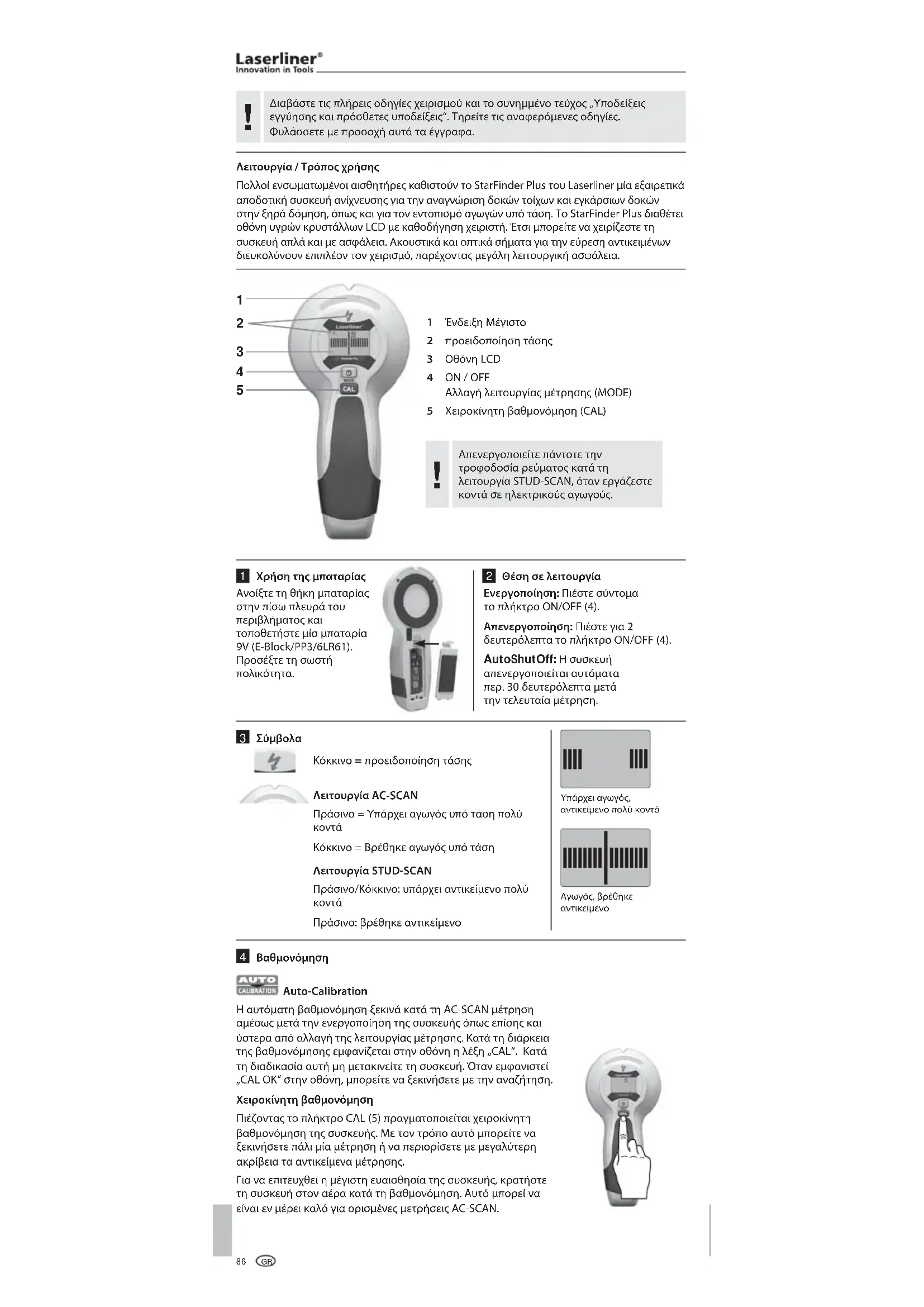 Λειτουργία / Τρόπος χρήσης Πολλοί ενσωματωμένοι αισθητήρες καθιστούν το StarFinder Plus του Laserliner μία εξαιρετικά αποδοτική συσκευή ανίχνευσης για την αναγνώριση δοκών τοίχων και εγκάρσιων δοκών στην ξηρά δόμηση, όπως και για τον εντοπισμό αγωγών υπό τάση. Το StarFinder Plus διαθέτει οθόνη υγρών κρυστάλλων LCD με καθοδήγηση χειριστή. Έτσι μπορείτε να χειρίζεστε τη συσκευή απλά και με ασφάλεια. Ακουστικά και οπτικά σήματα για την εύρεση αντικειμένων διευκολύνουν επιπλέον τον χειρισμό, παρέχοντας μεγάλη λειτουργική ασφάλεια. Ένδειξη Μέγιστο προειδοποίηση τάσης Οθόνη LCD ON / OFF Αλλαγή λειτουργίας μέτρησης (MODE) Χειροκίνητη βαθμονόμηση (CAL) Ανοίξτε τη θήκη μπαταρίας στην πίσω πλευρά του περιβλήματος και τοποθετήστε μία μπαταρία 9V (E-Block/PP3/6LR61). Προσέξτε τη σωστή πολικότητα. Χρήση της μπαταρίας Ενεργοποίηση: Πιέστε σύντομα το πλήκτρο ΟΝ/ΟFF (4). Απενεργοποίηση: Πιέστε για 2 δευτερόλεπτα το πλήκτρο ΟΝ/ΟFF (4). AutoShutOff: Η συσκευή απενεργοποιείται αυτόματα περ. 30 δευτερόλεπτα μετά την τελευταία μέτρηση. Θέση σε λειτουργία Auto-Calibration Η αυτόματη βαθμονόμηση ξεκινά κατά τη AC-SCAN μέτρηση αμέσως μετά την ενεργοποίηση της συσκευής όπως επίσης και ύστερα από αλλαγή της λειτουργίας μέτρησης. Κατά τη διάρκεια της βαθμονόμησης εμφανίζεται στην οθόνη η λέξη „CAL“. Κατά τη διαδικασία αυτή μη μετακινείτε τη συσκευή. Όταν εμφανιστεί „CAL OK“ στην οθόνη, μπορείτε να ξεκινήσετε με την αναζήτηση. Βαθμονόμηση Χειροκίνητη βαθμονόμηση Πιέζοντας το πλήκτρο CAL (5) πραγματοποιείται χειροκίνητη βαθμονόμηση της συσκευής. Με τον τρόπο αυτό μπορείτε να ξεκινήσετε πάλι μία μέτρηση ή να περιορίσετε με μεγαλύτερη ακρίβεια τα αντικείμενα μέτρησης. Για να επιτευχθεί η μέγιστη ευαισθησία της συσκευής, κρατήστε τη συσκευή στον αέρα κατά τη βαθμονόμηση. Αυτό μπορεί να είναι εν μέρει καλό για ορισμένες μετρήσεις AC-SCAN. Απενεργοποιείτε πάντοτε την τροφοδοσία ρεύματος κατά τη λειτουργία STUD-SCAN, όταν εργάζεστε κοντά σε ηλεκτρικούς αγωγούς.
