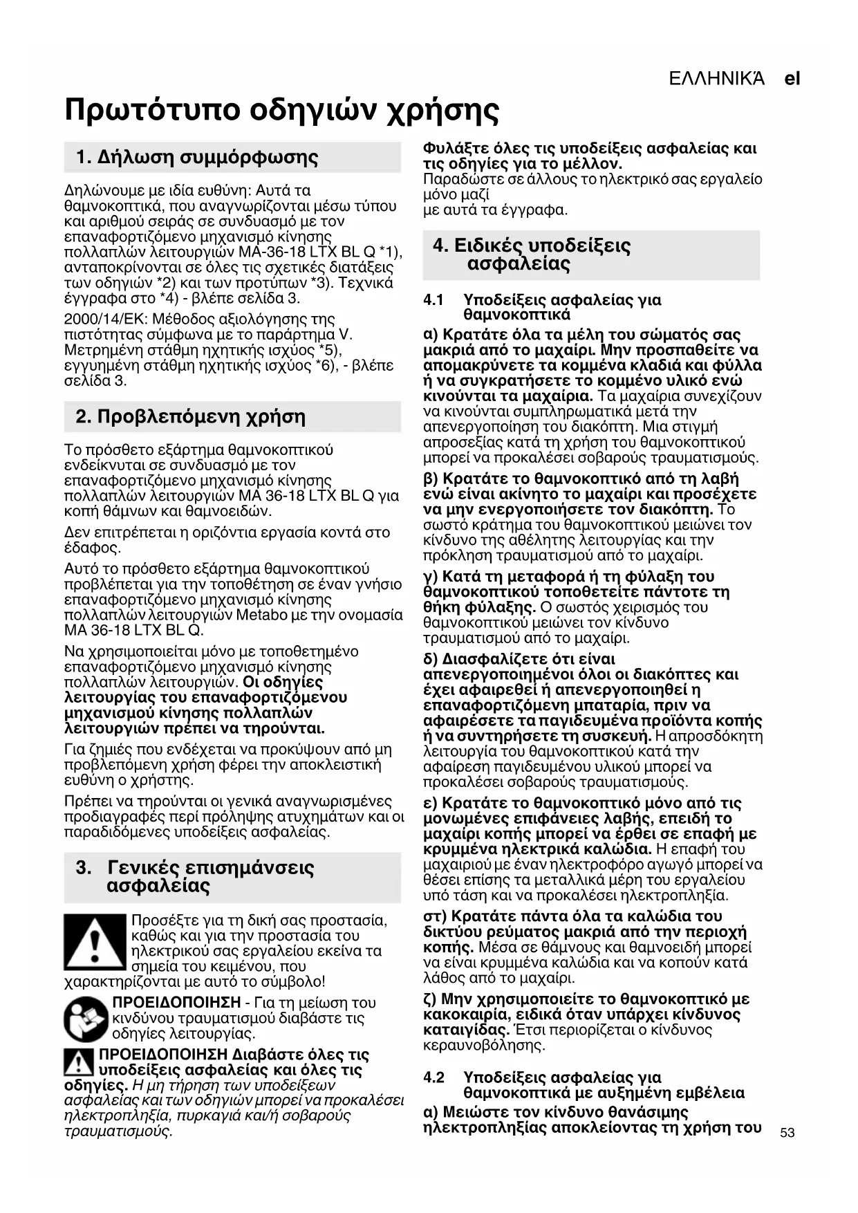 λειτουργιών Metabo με την ονομασία MA 36-18 LTX BL Q. Να χρησιμοποιείται μόνο με τοποθετημένο επαναφορτιζόμενο μηχανισμό κίνησης πολλαπλών λειτουργιών. Οι οδηγίες λειτουργίας του επαναφορτιζόμενου μηχανισμού κίνησης πολλαπλών λειτουργιών πρέπει να τηρούνται. Για ζημιές που ενδέχεται να προκύψουν από μη προβλεπόμενη χρήση φέρει την αποκλειστική ευθύνη ο χρήστης. Πρέπει να τηρούνται οι γενικά αναγνωρισμένες προδιαγραφές περί πρόληψης ατυχημάτων και οι παραδιδόμενες υποδείξεις ασφαλείας. Προσέξτε για τη δική σας προστασία, καθώς και για την προστασία του ηλεκτρικού σας εργαλείου εκείνα τα σημεία του κειμένου, που χαρακτηρίζονται με αυτό το σύμβολο! ΠΡΟΕΙΔΟΠΟΙΗΣΗ - Για τη μείωση του κινδύνου τραυματισμού διαβάστε τις οδηγίες λειτουργίας. ΠΡΟΕΙΔΟΠΟΙΗΣΗ Διαβάστε όλες τις υποδείξεις ασφαλείας και όλες τις οδηγίες. Η μη τήρηση των υποδείξεων ασφαλείας και των οδηγιών μπορεί να προκαλέσει ηλεκτροπληξία, πυρκαγιά και/ή σοβαρούς τραυματισμούς. Φυλάξτε όλες τις υποδείξεις ασφαλείας και τις οδηγίες για το μέλλον. Παραδώστε σε άλλους το ηλεκτρικό σας εργαλείο