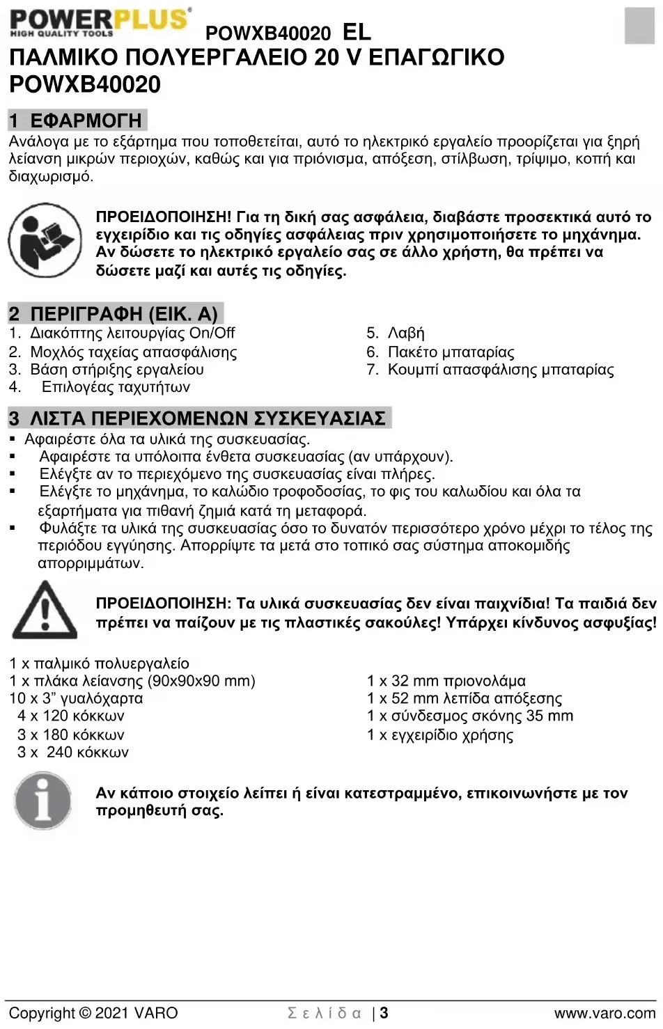 - 15 ΔΗΛΩΣΗ ΣΥΜΜΟΡΦΩΣΗΣ POWXB40020 EL Copyright © 2021 VARO Σ ε λ ί δ α | 3 www.varo.com ΠΑΛΜΙΚΟ ΠΟΛΥΕΡΓΑΛΕΙΟ 20 V ΕΠΑΓΩΓΙΚΟ POWXB40020 1 ΕΦΑΡΜΟΓΗ Ανάλογα με το εξάρτημα που τοποθετείται, αυτό το ηλεκτρικό εργαλείο προορίζεται για ξηρή λείανση μικρών περιοχών, καθώς και για πριόνισμα, απόξεση, στίλβωση, τρίψιμο, κοπή και διαχωρισμό. ΠΡΟΕΙΔΟΠΟΙΗΣΗ! Για τη δική σας ασφάλεια, διαβάστε προσεκτικά αυτό το εγχειρίδιο και τις οδηγίες ασφάλειας πριν χρησιμοποιήσετε το μηχάνημα. Αν δώσετε το ηλεκτρικό εργαλείο σας σε άλλο χρήστη, θα πρέπει να δώσετε μαζί και αυτές τις οδηγίες. 2 ΠΕΡΙΓΡΑΦΗ (ΕΙΚ. A) p. 15