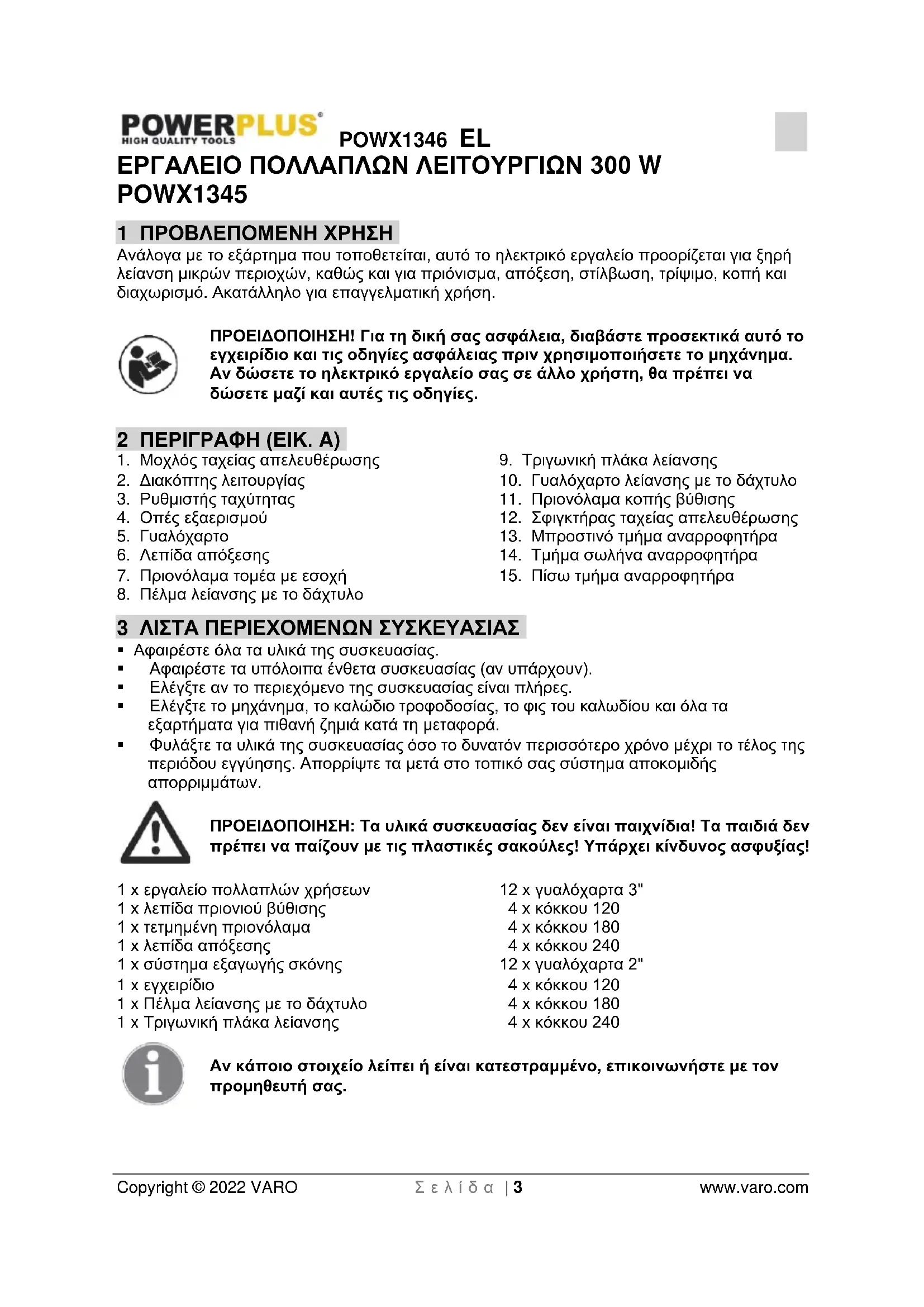 - POWX1346 EL Copyright © 2022 VARO Σ ε λ ί δ α | 2 www.varo.com 14 ΔΗΛΩΣΗ ΣΥΜΜΟΡΦΩΣΗΣ POWX1346 EL Copyright © 2022 VARO Σ ε λ ί δ α | 3 www.varo.com ΕΡΓΑΛΕΙΟ ΠΟΛΛΑΠΛΩΝ ΛΕΙΤΟΥΡΓΙΩΝ 300 W POWX1345 1 ΠΡΟΒΛΕΠΟΜΕΝΗ ΧΡΗΣΗ Ανάλογα με το εξάρτημα που τοποθετείται, αυτό το ηλεκτρικό εργαλείο προορίζεται για ξηρή λείανση μικρών περιοχών, καθώς και για πριόνισμα, απόξεση, στίλβωση, τρίψιμο, κοπή και διαχωρισμό. Ακατάλληλο για επαγγελματική χρήση. ΠΡΟΕΙΔΟΠΟΙΗΣΗ! Για τη δική σας ασφάλεια, διαβάστε προσεκτικά αυτό το εγχειρίδιο και τις οδηγίες ασφάλειας πριν χρησιμοποιήσετε το μηχάνημα. Αν δώσετε το ηλεκτρικό εργαλείο σας σε άλλο χρήστη, θα πρέπει να δώσετε μαζί και αυτές τις οδηγίες. 2 ΠΕΡΙΓΡΑΦΗ (ΕΙΚ. A) p. 12