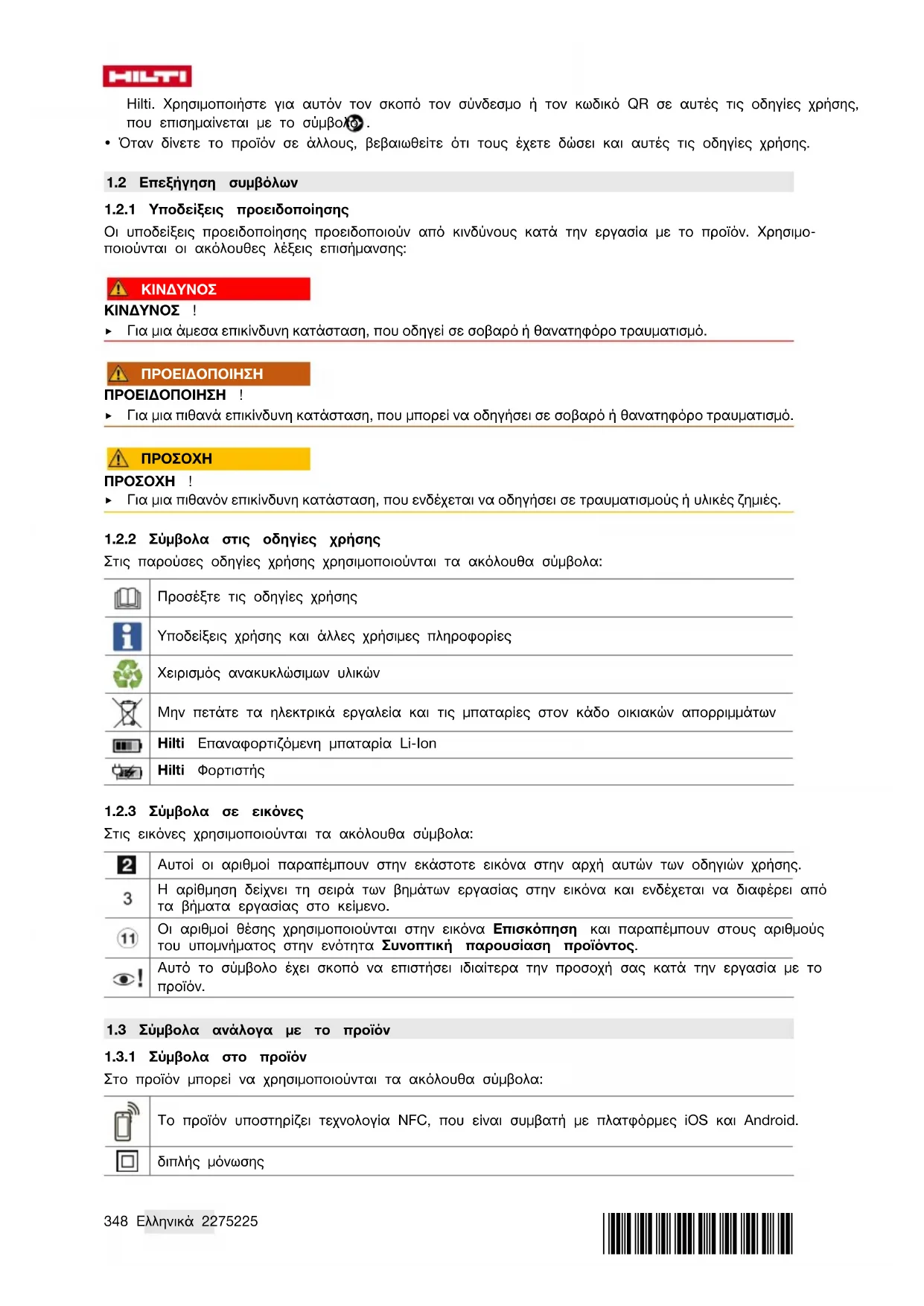 - Οι συνημμένες οδηγίες χρήσης αντιστοιχούν στο τρέχον επίπεδο της τεχνολογίας τη στιγμή της εκτύπωσης. Μπορείτε να βρίσκετε πάντα την τρέχουσα έκδοση online στη σελίδα προϊόντων της348 Ελληνικά 2275225 *2275225* Hilti. Χρησιμοποιήστε για αυτόν τον σκοπό τον σύνδεσμο ή τον κωδικό QR σε αυτές τις οδηγίες χρήσης, που επισημαίνεται με το σύμβολο .