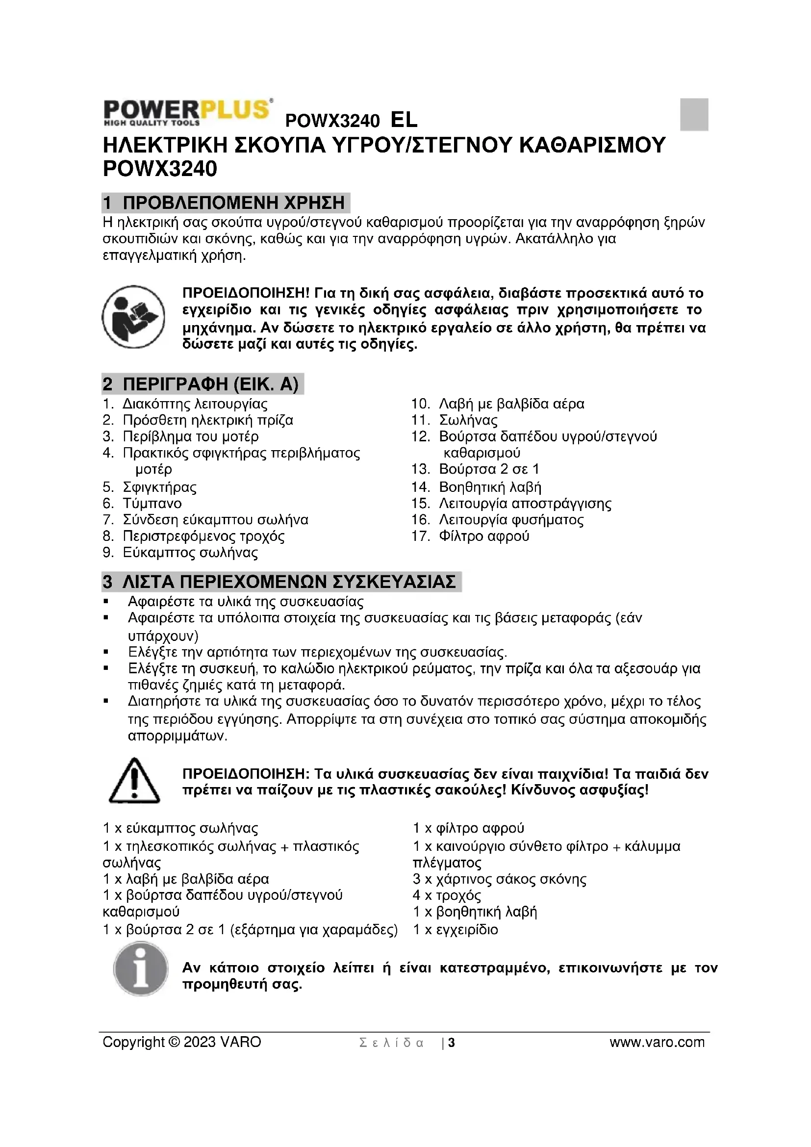 - 16 ΔΗΛΩΣΗ ΣΥΜΜΟΡΦΩΣΗΣ POWX3240 EL Copyright © 2023 VARO Σ ε λ ί δ α | 3 www.varo.com ΗΛΕΚΤΡΙΚΗ ΣΚΟΥΠΑ ΥΓΡΟΥ/ΣΤΕΓΝΟΥ ΚΑΘΑΡΙΣΜΟΥ POWX3240 1 ΠΡΟΒΛΕΠΟΜΕΝΗ ΧΡΗΣΗ Η ηλεκτρική σας σκούπα υγρού/στεγνού καθαρισμού προορίζεται για την αναρρόφηση ξηρών σκουπιδιών και σκόνης, καθώς και για την αναρρόφηση υγρών. Ακατάλληλο για επαγγελματική χρήση. ΠΡΟΕΙΔΟΠΟΙΗΣΗ! Για τη δική σας ασφάλεια, διαβάστε προσεκτικά αυτό το εγχειρίδιο και τις γενικές οδηγίες ασφάλειας πριν χρησιμοποιήσετε το μηχάνημα. Αν δώσετε το ηλεκτρικό εργαλείο σε άλλο χρήστη, θα πρέπει να δώσετε μαζί και αυτές τις οδηγίες. 2 ΠΕΡΙΓΡΑΦΗ (ΕΙΚ. A) p. 11