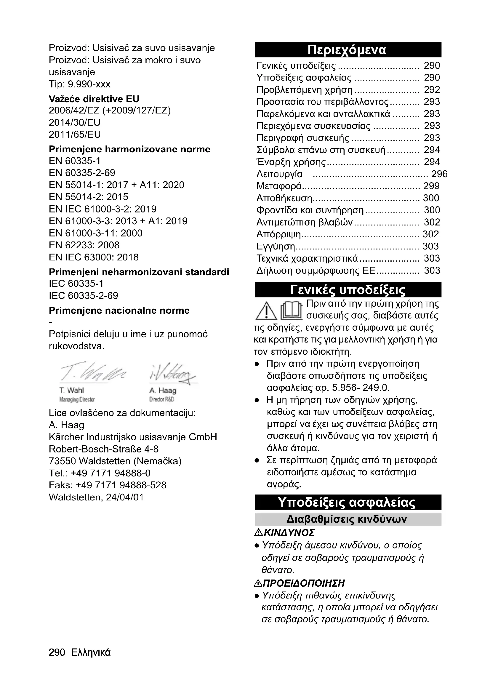 Potpisnici deluju u ime i uz punomoć rukovodstva. Lice ovlašćeno za dokumentaciju: A. Haag Kärcher Industrijsko usisavanje GmbH Robert-Bosch-Straße 4-8 73550 Waldstetten (Nemačka) Tel.: +49 7171 94888-0 Faks: +49 7171 94888-528 Waldstetten, 24/04/01 Περιεχόμενα Γενικές υποδείξεις Πριν από την πρώτη χρήση της συσκευής σας, διαβάστε αυτές τις οδηγίες, ενεργήστε σύμφωνα με αυτές και κρατήστε τις για μελλοντική χρήση ή για τον επόμενο ιδιοκτήτη. ● Πριν από την πρώτη ενεργοποίηση διαβάστε οπωσδήποτε τις υποδείξεις ασφαλείας αρ. 5.956- 249.0. ●Η μη τήρηση των οδηγιών χρήσης, καθώς και των υποδείξεων ασφαλείας,
