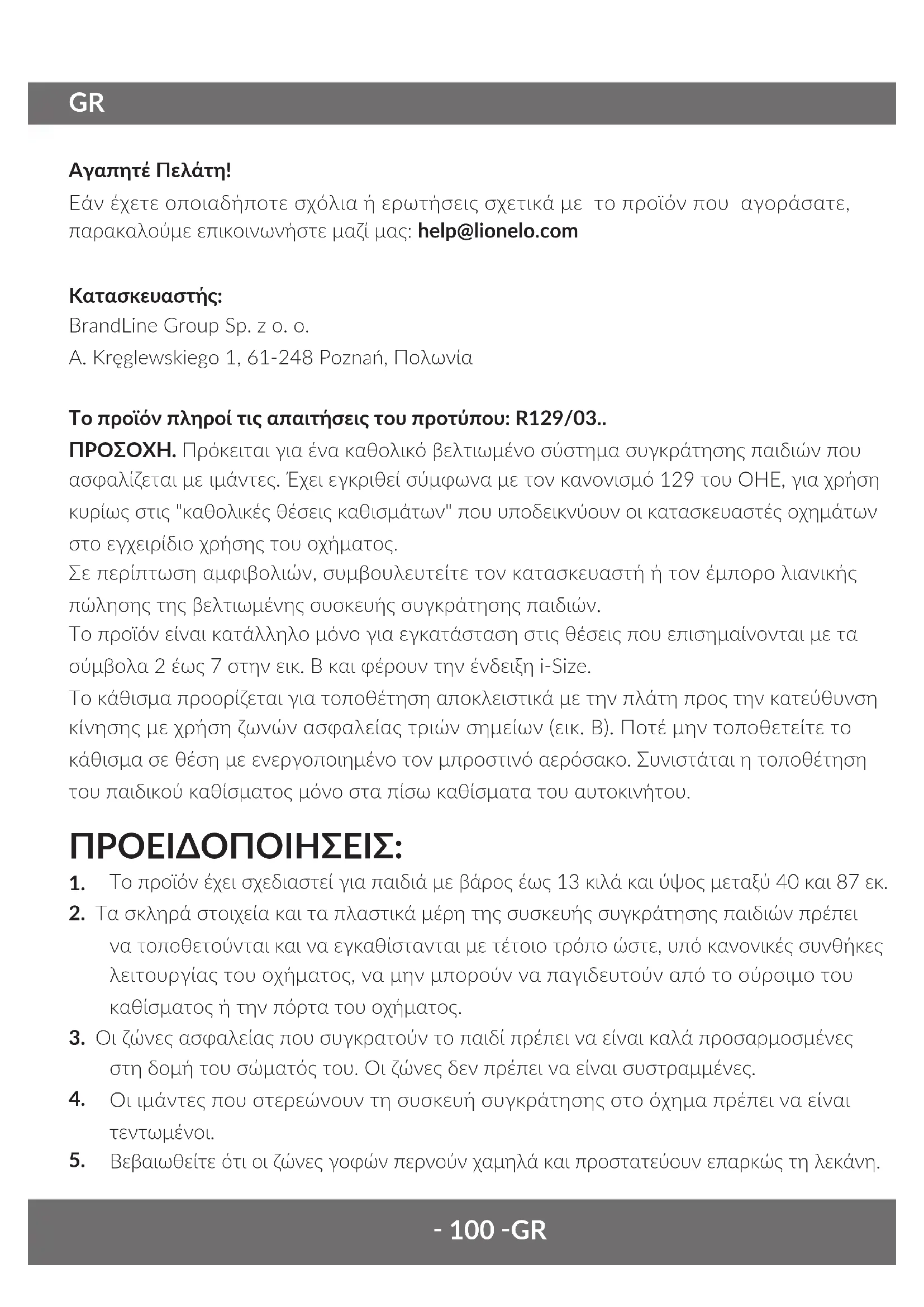 - Atenção! Não ulizar detergentes fortes nem agentes de branqueamento. As imagens são meramente ilustravas; o aspeto real dos produtos pode ser diferente do apresentado nas imagens.‑ 100 ‑GR Αγαπητέ Πελάτη! Εάν έχετε οποιαδήποτε σχόλια ή ερωτήσεις σχετικά με το προϊόν που αγοράσατε, παρακαλούμε επικοινωνήστε μαζί μας: help@lionelo.com Κατασκευαστής: BrandLine Group Sp. z o. o. A. Kręglewskiego 1, 61-248 Poznań, Πολωνία Το προϊόν πληροί τις απαιτήσεις του προτύπου: R129/03.. ΠΡΟΣΟΧΗ. Πρόκειται για ένα καθολικό βελτιωμένο σύστημα συγκράτησης παιδιών που ασφαλίζεται με ιμάντες. Έχει εγκριθεί σύμφωνα με τον κανονισμό 129 του ΟΗΕ, για χρήση κυρίως στις "καθολικές θέσεις καθισμάτων" που υποδεικνύουν οι κατασκευαστές οχημάτων στο εγχειρίδιο χρήσης του οχήματος. Σε περίπτωση αμφιβολιών, συμβουλευτείτε τον κατασκευαστή ή τον έμπορο λιανικής πώλησης της βελτιωμένης συσκευής συγκράτησης παιδιών. Το προϊόν είναι κατάλληλο μόνο για εγκατάσταση στις θέσεις που επισημαίνονται με τα σύμβολα 2 έως 7 στην εικ. Β και φέρουν την ένδειξη i-Size. Το κάθισμα προορίζεται για τοποθέτηση αποκλειστικά με την πλάτη προς την κατεύθυνση κίνησης με χρήση ζωνών ασφαλείας τριών σημείων (εικ. Β). Ποτέ μην τοποθετείτε το κάθισμα σε θέση με ενεργοποιημένο τον μπροστινό αερόσακο. Συνιστάται η τοποθέτηση του παιδικού καθίσματος μόνο στα πίσω καθίσματα του αυτοκινήτου. ΠΡΟΕΙΔΟΠΟΙΗΣΕΙΣ: