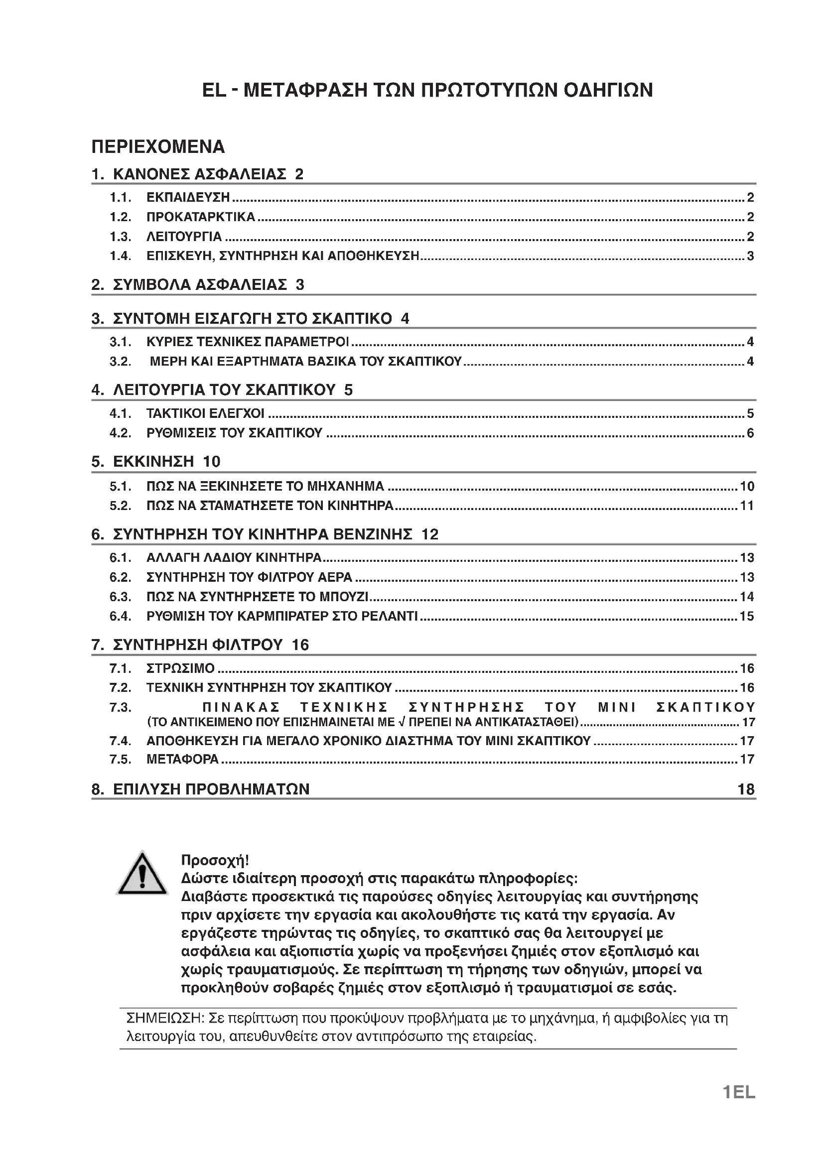 Δώστε ιδιαίτερη προσοχή στις παρακάτω πληροφορίες: Διαβάστε προσεκτικά τις παρούσες οδηγίες λειτουργίας και συντήρησης πριν αρχίσετε την εργασία και ακολουθήστε τις κατά την εργασία. Άν εργάζεστε τηρώντας τις οδηγίες, το σκαπτικό σας θα λειτουργεί με ασφάλεια και αξιοπιστία χωρίς να προξενήσει ζημιές στον εξοπλισμό και χωρίς τραυματισμούς. Σε περίπτωση τη τήρησης των οδηγιών, μπορεί να προκληθούν σοβαρές ζημιές στον εξοπλισμό ή τραυματισμοί σε εσάς. ΣΗΜΕΙΩΣΗ: Σε περίπτωση που προκύψουν προβλήματα με το μηχάνημα, ή αμφιβολίες για τη λειτουργία του, απευθυνθείτε στον αντιπρόσωπο της εταιρείας. ΠΕΡΙΕΧΟΜΕΝΆ