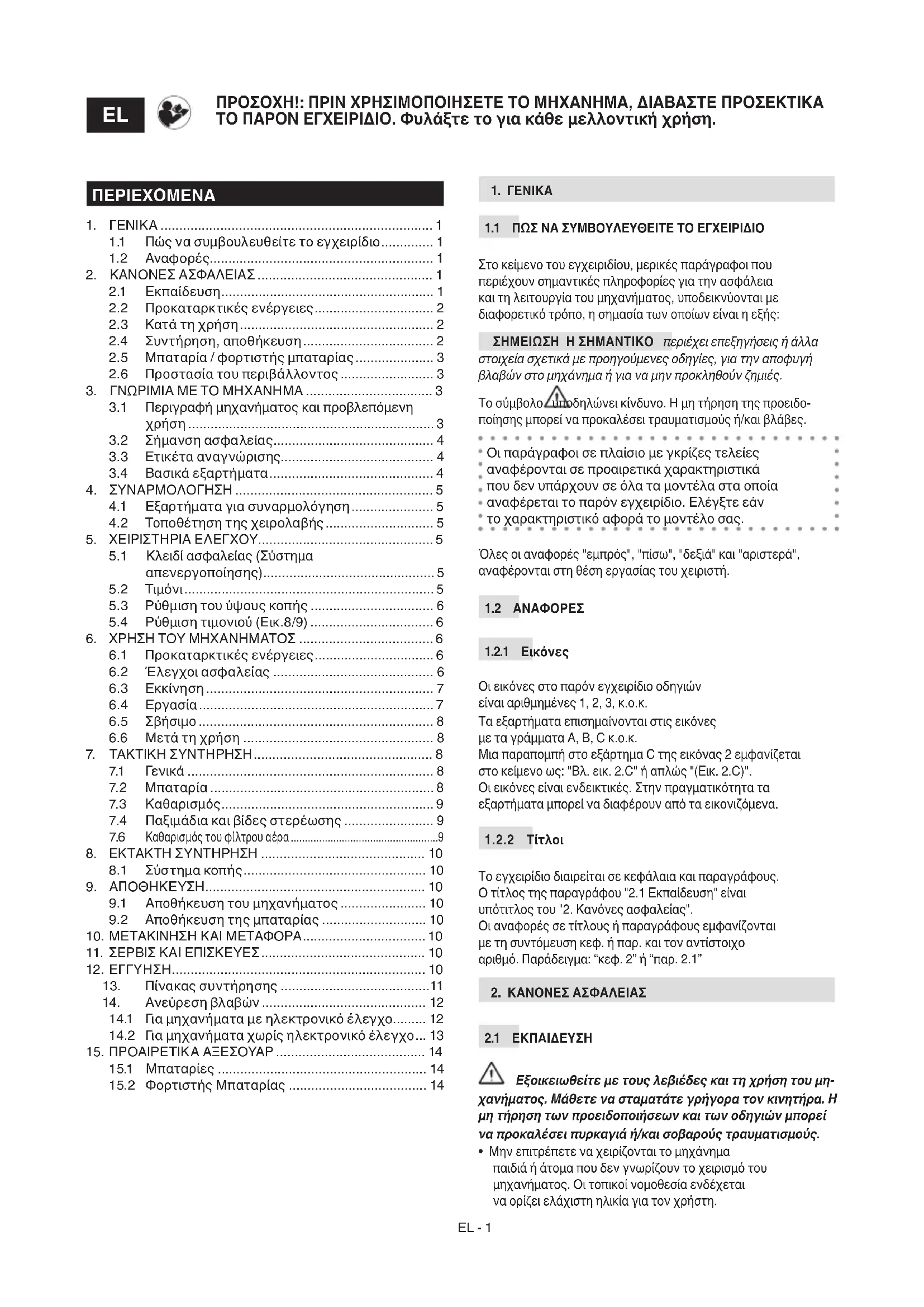 ΣΗΜΑΝΤΙΚΟ Οι παρακάτω κανονισμοί ασφαλείας συμπληρώνουν τις προδιαγραφές ασφαλείας που υπάρχουν στις οδηγίες χρήσης της μπαταρίας και του φορτιστή μπαταρίας που επισυνάπτονται στο μηχάνημα.